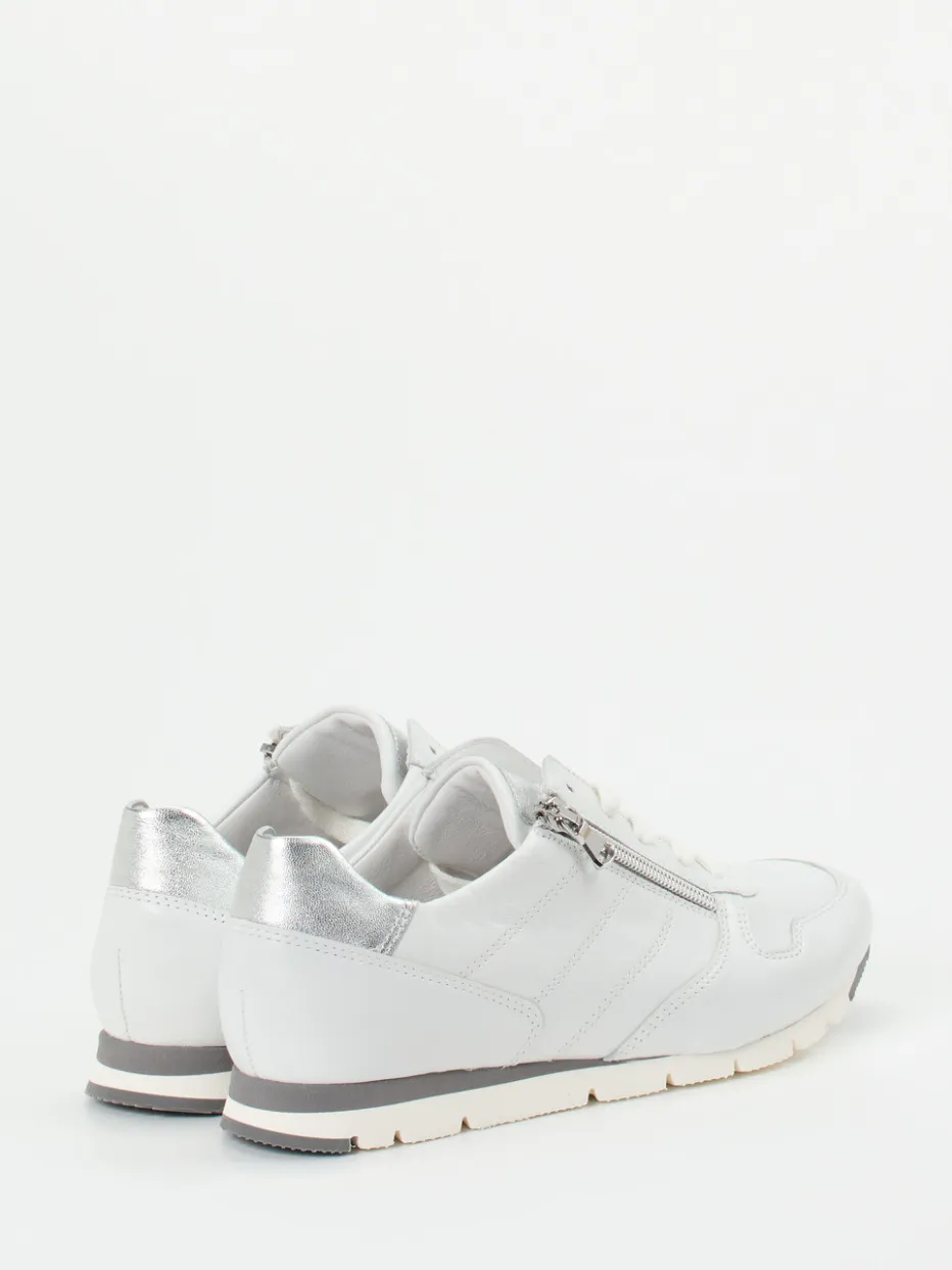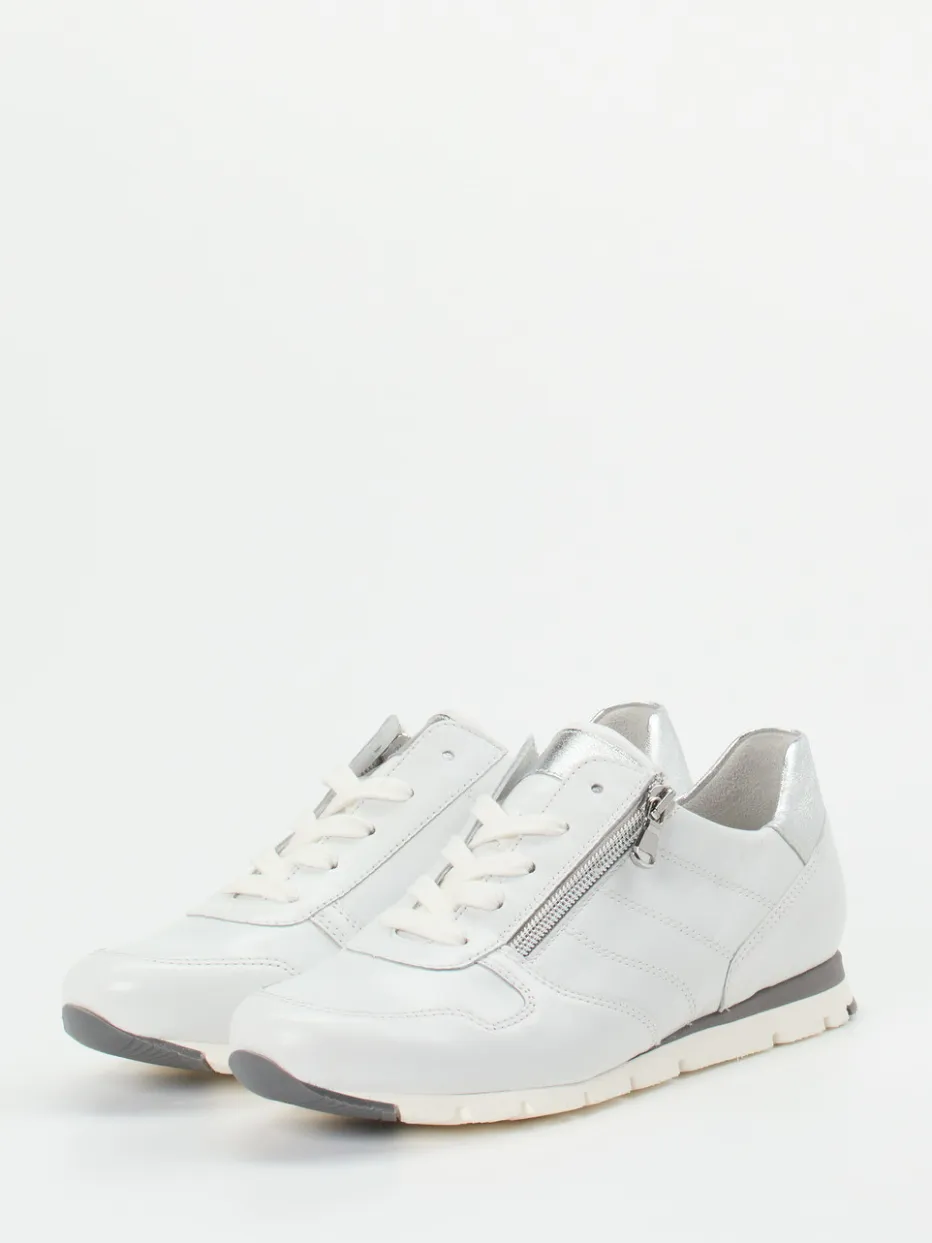 Perfekter Mix aus Komfort und Ästhetik.Der Komfort-Sneaker von Semler überzeugt durch hochwertige Verarbeitung und durchdachte Funktionalität. Für entspannte Alltagsmomente bietet das Modell aus weißem Kalbleder mit glänzendem Finish und silberfarbenen Metallic-Akzenten an Ferse und Zunge stilvollen Mehrwert. Klassisch-sportliche Silhouette, seitlicher Reißverschluss, tonige Schnürung und rutschhemmende Gummisohle ermöglichen komfortables Tragen und einfaches Handling. Metallic-Details und die klare Formgebung passen zum modernen Streetwear-Trend. Besonders harmonisch wirkt die Kombination mit hellen Casual-Hosen oder einer silbernen Crossbody-Bag. Semler steht für bequeme Passform und dezente Eleganz mit femininer Ausstrahlung.