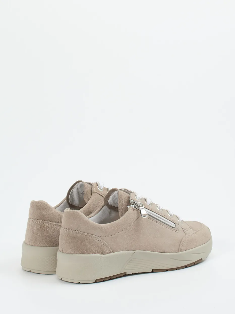 Stilvoll unterwegs mit Leichtigkeit.Semler präsentiert einen Komfort-Sneaker mit sportlich-lässigem Design für Damen. Für entspannte Alltagsmomente überzeugt der Schuh mit anschmiegsamem Veloursleder, samtig angeschliffen in elegantem Beige. Die klassisch runde Silhouette wird durch tonige Nähte und zweifarbige Schnürsenkel strukturiert. Ein silberfarbener Seitenreißverschluss erleichtert den Einstieg, das Leder-Textilfutter sorgt für angenehmes Klima. Die Gummisohle mit Luftpolsterung und rutschhemmendem Profil bietet Trittsicherheit. Perfekt für Soft-Neutrals-Looks im Frühling/Sommer. Fußgerechter Komfort und puristisches Design – typisch Semler.