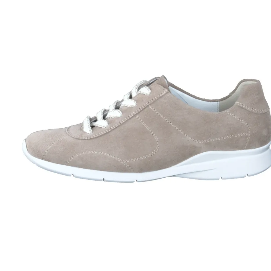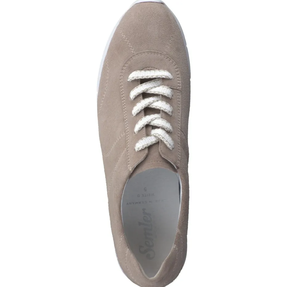Schlichte Eleganz für jeden Tag.Die Marke Semler zeigt mit diesem Komfortsneaker für Damen ein Modell voller subtiler Raffinesse. Ideal für Alltag und Freizeit überzeugt der beige Schnürschuh mit softem Veloursleder, samtig angeschliffen und matt in der Oberfläche. Die Kombination mit einer weißen Kontrastsohle und fein abgestimmter Ton-in-Ton-Schnürung wirkt angenehm zurückhaltend. Der gepolsterte Einstieg, das wechselbare Fußbett und die leichte PU-Laufsohle sorgen dabei für optimale Bequemlichkeit. Design und Funktion reflektieren einen minimalistisch-casual Look, passend zur Saison „Soft Neutrals SS24“. Gut kombinierbar mit Naturtönen oder hellen Relaxwear-Stücken. Semler vereint komfortorientiertes Design mit stilvoller Zurückhaltung.