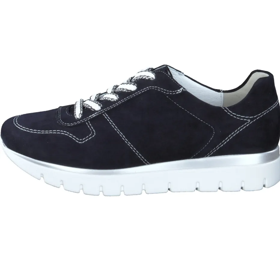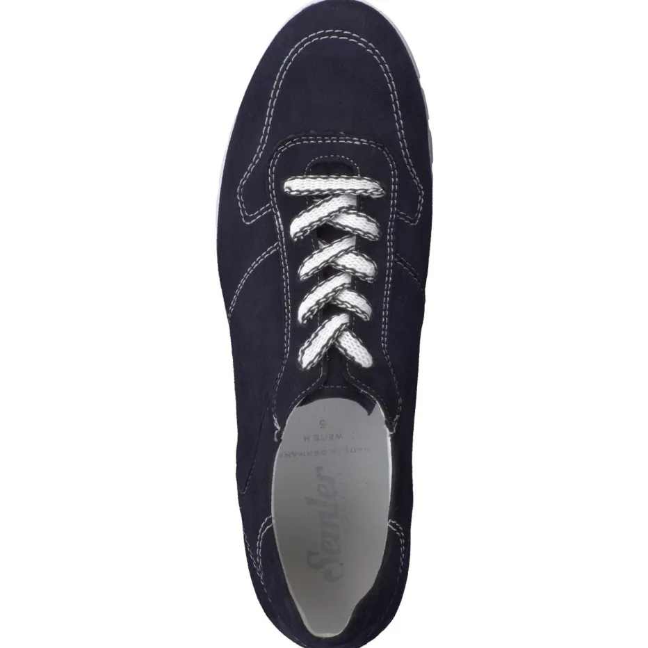 Alltag trifft auf Soft-Komfort.Semler präsentiert einen Komfort-Sneaker für Damen, der sportliche Lässigkeit und feminine Linienführung miteinander vereint. Ideal für entspannte Spaziergänge oder den täglichen Stadtbummel: Das dunkelblaue Veloursleder zeigt sich samtig angeschliffen und wird durch weiße Kontrastnähte akzentuiert. Die klassische Sneaker-Silhouette mit breiter Schnürung, ergonomischem Schaftrand und leichter PU-Sohle mit sternenstrukturierter Profilierung sorgt für Trittsicherheit und hohen Gehkomfort. Silberfarbene Details setzen zusätzliche optische Akzente. Der Schuh verfügt über eine herausnehmbare Innensohle und eignet sich für breite Füße dank Weite H. Markentypischer Tragekomfort mit stilvoll sportivem Twist.