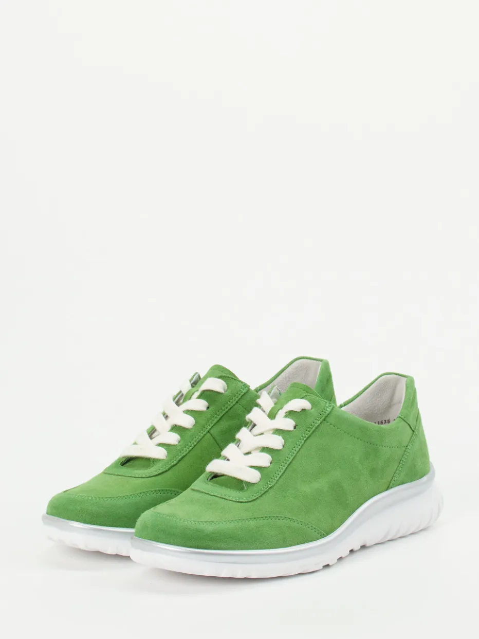 Frischer Komfort für aktive Tage.Semler präsentiert mit diesem Komfort-Sneaker einen gelungenen Mix aus Stil und Funktion. Ideal für entspannte Freizeitmomente sorgt das ergonomische Fußbett in Kombination mit der gelenkschonenden Luftpolstersohle für spürbaren Tragekomfort. Das grasgrüne Veloursleder überzeugt durch seine matte, samtweiche Oberfläche und harmoniert mit weißen Schnürsenkeln und einem silberfarbenen Sohlenrand. Die sportive Form und das gepolsterte Innenfutter unterstreichen den Casual-Charakter, während dezente Steppnähte und die Weite H für individuellen Sitz sorgen. Ein Sneaker im Zeichen des „Comfort Core“-Trends – perfekt zu Stretch-Jeans oder Funktionsjacke. Semler steht für hochwertige Materialien und komfortbetontes Design.