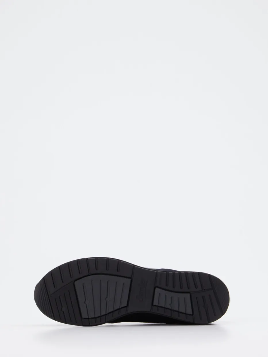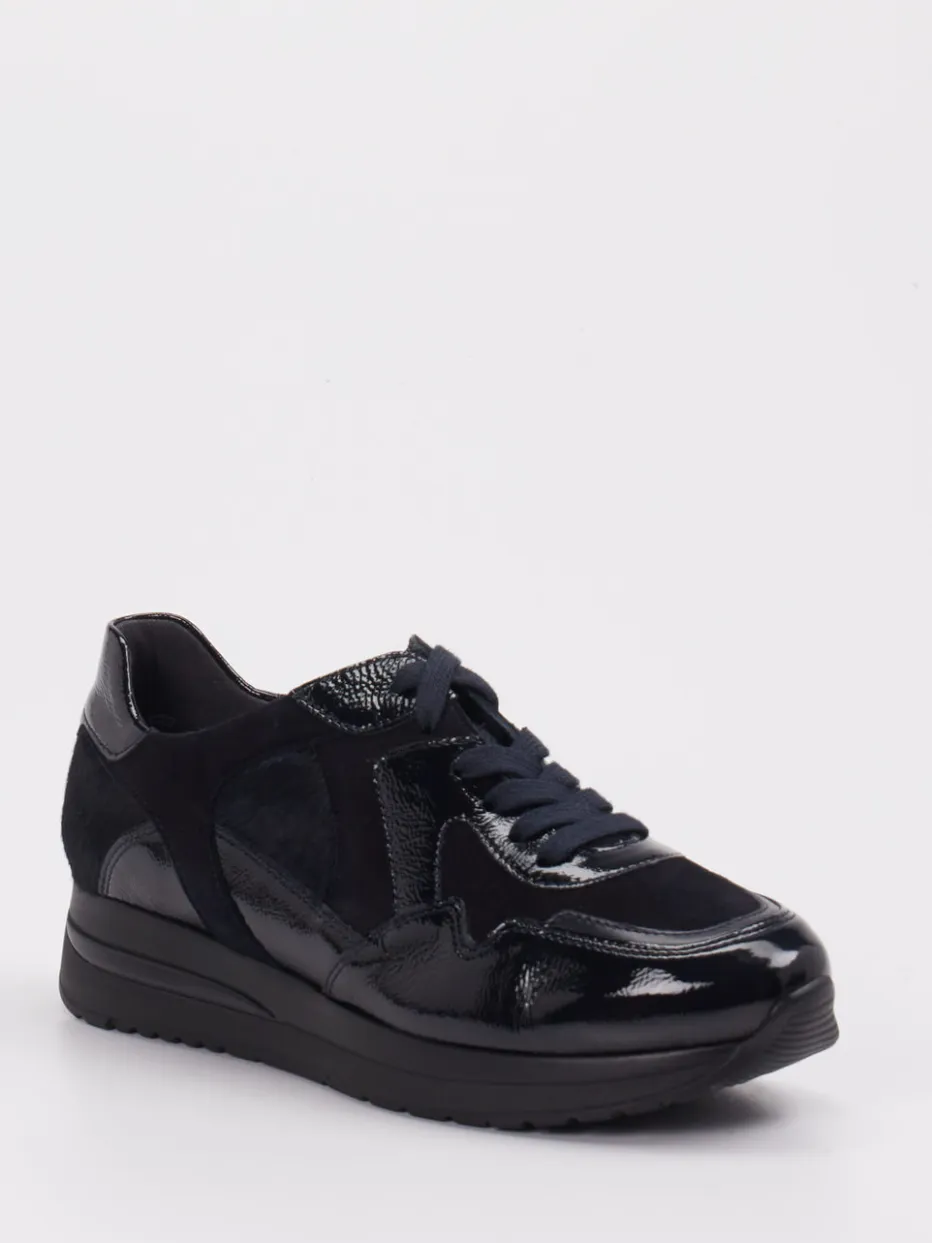 Elegant kombinierter Materialmix.Der Komfort-Sneaker von Semler überzeugt durch eine spannungsreiche Kombination aus Veloursleder, glänzendem Lackleder und Ponyfelloptik. Ideal für anspruchsvolle Alltagslooks, bietet das Modell in sattem Schwarz eine rutschhemmende PU-Sohle und eine bequeme H-Weite für ganztägigen Komfort. Die Ton-in-Ton-Schnürung, eine verstärkte Fersenkappe und die klassische Rundsilhouette stehen für dezente Eleganz mit Streetwear-Akzent. Mit dem Mix aus matten und glänzenden Oberflächen spiegelt dieser Schuh angesagte Black-on-Black-Trends und Materialkontraste wider. kombinationsfreundlich zu dunkler Jeans oder monochromen Office-Outfits. Komfort und Stil im modernen Minimalismus von Semler.