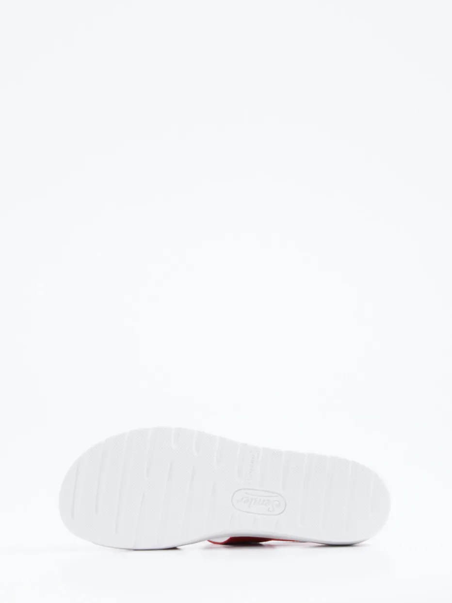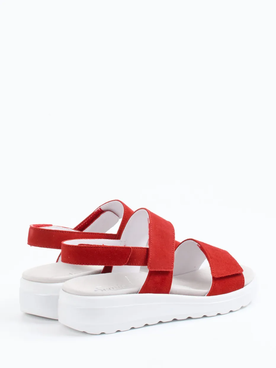 Für Urlaube, Stadtbummel oder entspannte Stunden daheim bietet dieses Modell mit seinem roten Veloursleder – samtig angeschliffen und matt – besonderen Komfort. Klettverschlüsse und ein ergonomisches Fußbett sorgen für individuelle Passform und bequemes Gehen. Die offene, ergonomische Silhouette wird stilvoll durch eine weiße PU-Laufsohle mit rutschhemmender Wirkung akzentuiert. Ton-in-Ton-Nähte und eine gepolsterte Innensohle unterstreichen den zurückhaltend-modernen Look. Ideal kombinierbar mit Leinenhose oder Sommerbluse.
