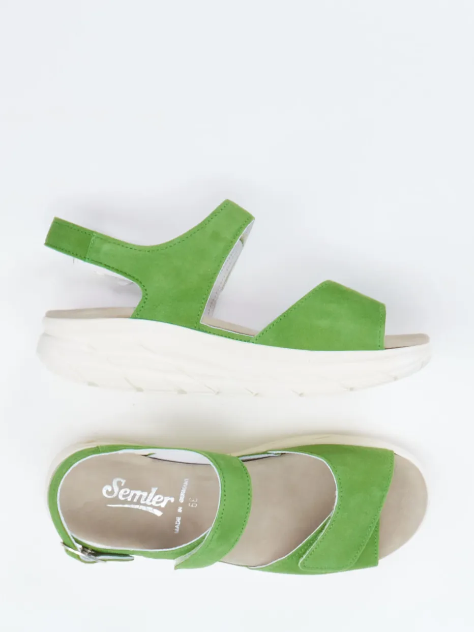 Farbstark durch die warme Jahreszeit.Die Marke Semler präsentiert mit dieser Komfortsandale ein Modell, das Funktion und ästhetischen Anspruch spielerisch vereint. An warmen Tagen sorgt die ergonomische Luftpolstersohle für spürbaren Komfort bei Spaziergang oder Bummel. Gefertigt aus grünem Veloursleder mit matter Oberfläche und ergänzt um silberfarbene Metallschnalle sowie apfelgrüne Klettverschlüsse, überzeugt sie auch visuell. Das weiche Lederfutter, die individuelle Verstellbarkeit durch Riegel und Schnalle sowie die Weite H sprechen für Alltagstauglichkeit mit modischem Twist – ganz im Zeichen des aktuellen Bold-Colors-Trends. Ideal zu Leinenblusen und luftigen Sommerhosen kombiniert. Semler steht für kompromisslosen Komfort und stilvolle Farbimpulse – made for modern Relaxwear.