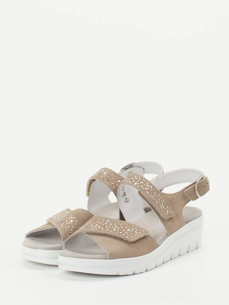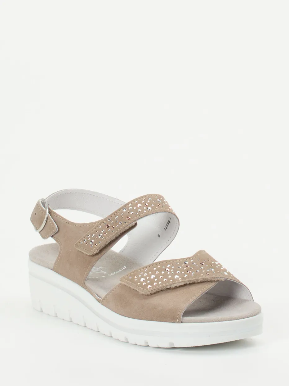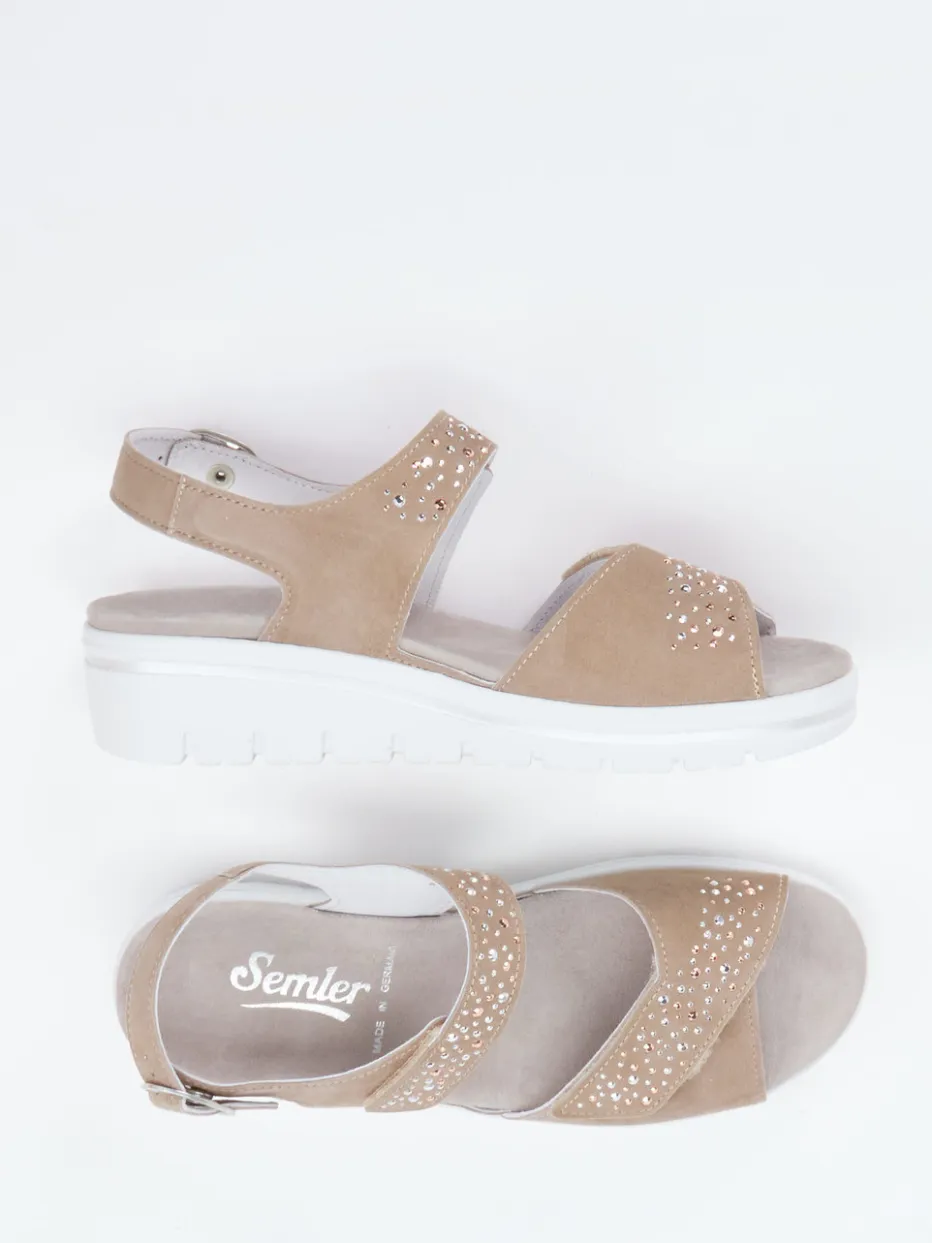 Eleganter Komfort für den Sommer.Die Marke Semler präsentiert mit dieser Komfortsandale ein ebenso funktionales wie stilvolles Modell für Damen. Für entspannte Spaziergänge und lange Sommertage im Freien bietet das weich gepolsterte Fußbett mit komfortabler Weite H eine ausgezeichnete Basis. Gefertigt aus samtigem Veloursleder in Beigebraun überzeugt die Sandale mit verstellbaren Riemen, funkelndem Schmucksteinbesatz und heller, profilierter Luftpolstersohle mit dezentem Kontrastrand. Der praktische Klettverschluss und die Schnalle mit Druckknopf garantieren optimalen Halt und einfaches Handling. Minimalistisches Design trifft auf modische Glitzerakzente – passend zum Sommertrend 2024. Semler steht für hochwertige Materialien und durchdachten Tragekomfort mit Alltagstauglichkeit.