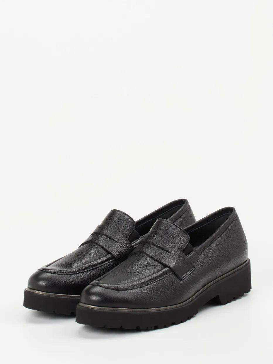 Elegant auftreten, bequem bleiben.Die Marke Semler präsentiert mit diesem Damen-Loafer einen stilvollen Begleiter für Alltag und Büro. Gefertigt aus schwarzem Kalbleder in genarbter Optik überzeugt das klassische Modell durch seine robuste Profilsohle mit metallisch glänzender Umrandung. Der praktische Schlupfeinstieg mit Penny-Riegel und die dezente Ton-in-Ton-Nahtführung unterstreichen den zeitlosen Charakter und bieten gleichzeitig modische Bodenhaftung. Dank bequemer Fußbettung und Weite G ist der Schuh auch für Einlagen geeignet und verbindet Komfort mit moderner Linienführung – inspiriert vom aktuellen Chunky-Loafer-Trend. Perfekt kombinierbar mit Trenchcoats oder Lederhandtaschen. Verlässlicher Komfort in urbaner Eleganz – made by Semler.