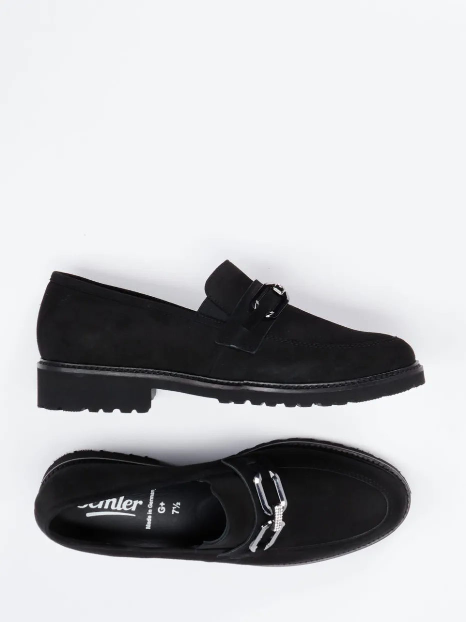 Stilvoller Komfort neu interpretiert.Semler präsentiert mit diesem Damenloafer ein Modell, das klassische Linie und Moderne vereint. Für Tage mit langem Stehen oder Gehen bietet der Loafer aus feinsamtigem Veloursleder verlässlichen Tragekomfort. In tiefem Schwarz gehalten, überzeugt das Design durch eine strukturierte, matte Oberfläche und eine auffällige Metallspange mit Strassdetails. Die flache Silhouette mit Blockabsatz, das gepolsterte Fußbett in Weite G sowie rutschhemmendes Profil geben sicheren Halt und ein gutes Laufgefühl. Inspiriert vom Chunky Loafer Trend und „Quiet Luxury“, harmoniert er mit Plissee-Rock und strukturierter Bag. Ein vielseitiger Begleiter mit Semler-typischer Qualität und Leichtigkeit.