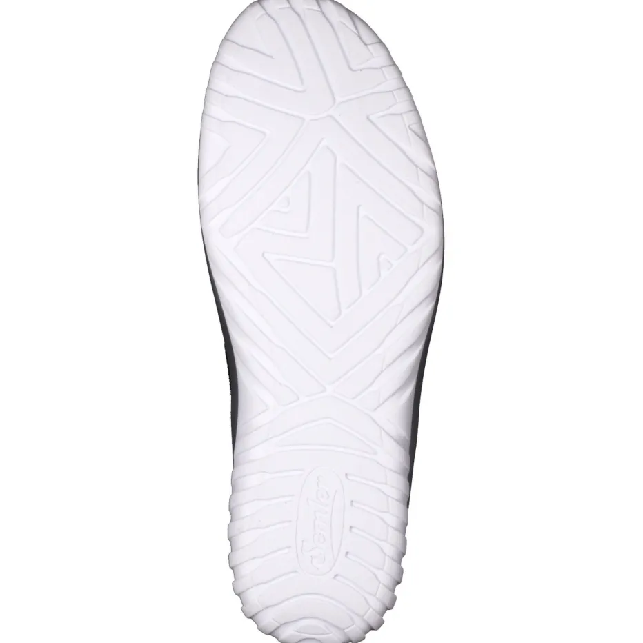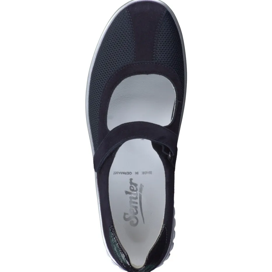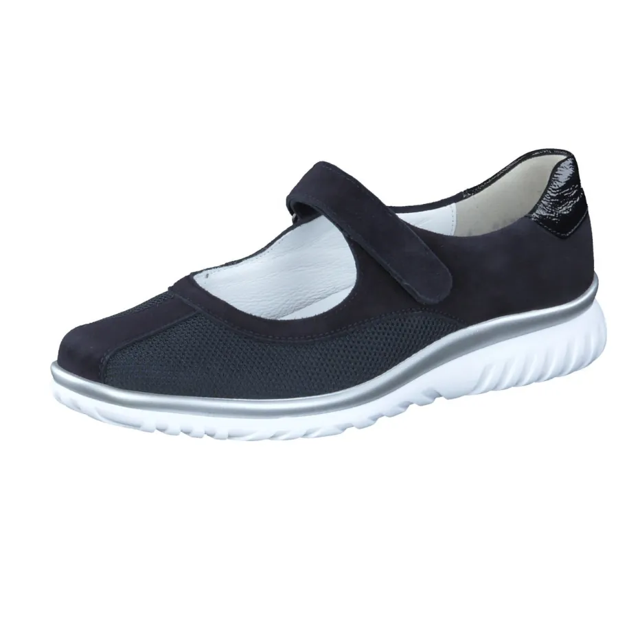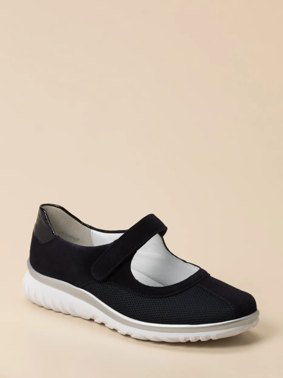 Bewegungsfreiheit mit Stil.Semler interpretiert den klassischen Mary Jane als bequemen Spangenschuh für den Alltag. Für entspannte Stunden zu Hause oder lange Tage unterwegs bietet das Modell dank Klettverschluss und weiter Leistenform einen unkomplizierten Einstieg und angenehmen Sitz. Dunkelblaues Veloursleder wird mit atmungsaktivem Mesh kombiniert, auch die glänzende Lackleder-Fersenkappe setzt ein dezentes Design-Statement. Die weich gepolsterte PU-Sohle federt jeden Schritt ab und ist mit einem silberfarbenen Rand modern akzentuiert. Funktionale Details wie das herausnehmbare Fußbett machen ihn bestens geeignet für Einlagen. Ideal zu Stretch-Jeans und Strickjacke. Semler steht hier für Komfort, der modern gedacht ist.