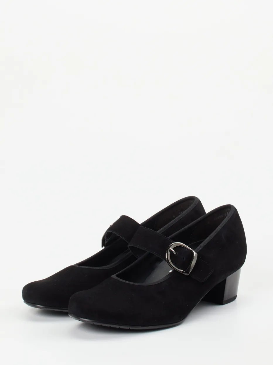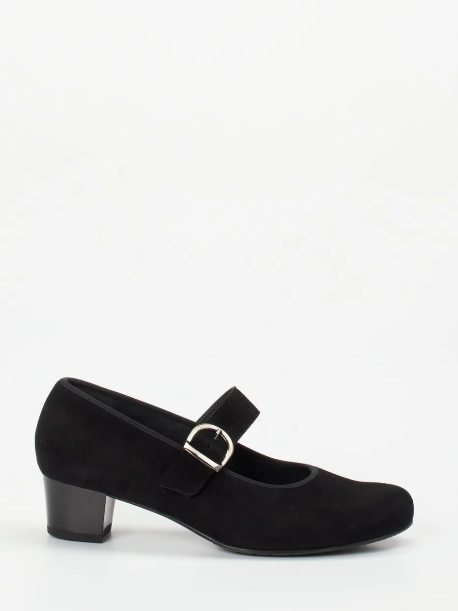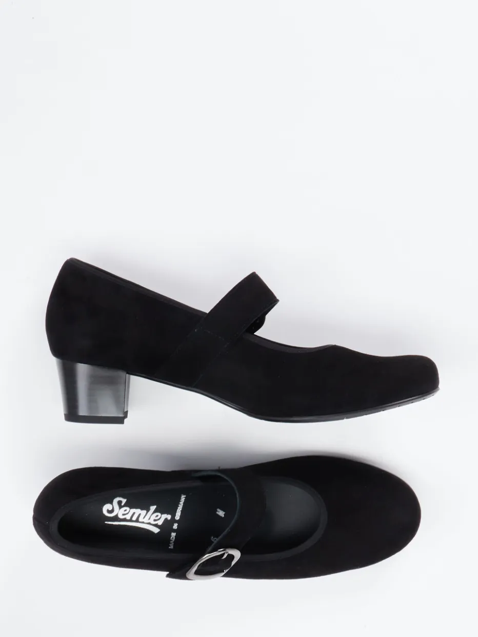 Die Marke Semler präsentiert klassische Mary Jane Pumps in schwarzem Veloursleder. Dieses Modell überzeugt durch klare Linien, hochwertigen Tragekomfort und dezente Raffinesse.