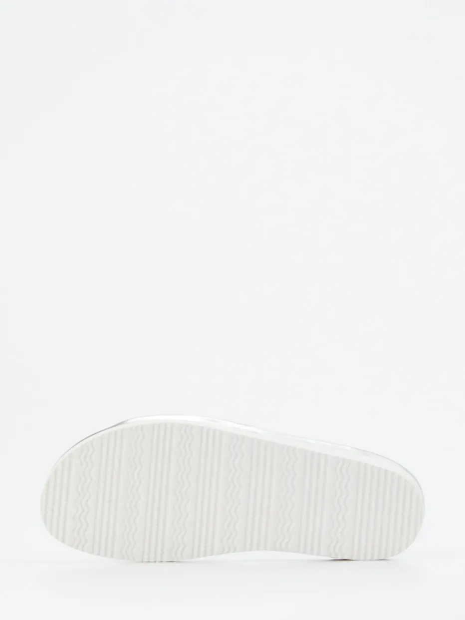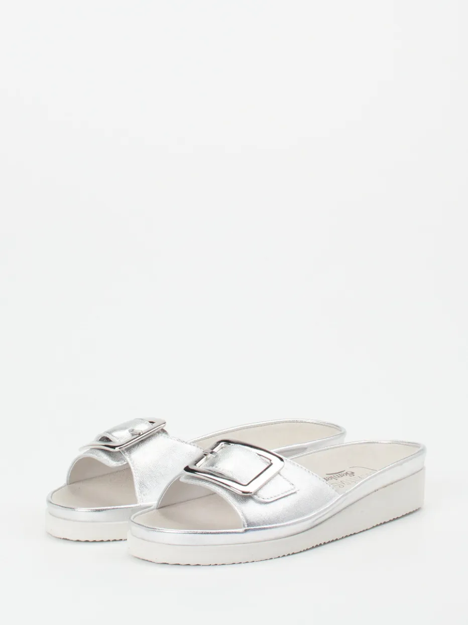 Glänzende Eleganz mit hohem Komfort: Diese silberfarbenen Pantoletten verbinden trendstarkes Metallicleder mit ergonomischer Keilsohle.