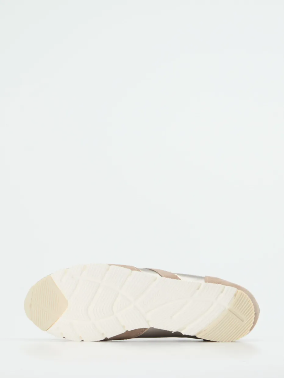 Ideal für entspannte Freizeitaktivitäten überzeugt das Modell durch beigefarbenes Veloursleder, ergänzt um satinartiges Textil und schimmernde Metallicdetails an Lasche und Ferse. Die flache, sportliche Silhouette mit breiter Schnürung und gepolstertem Schaftrand sorgt für Tragekomfort sowie sicheren Halt. Farblich bleibt der Look in Beige, Offwhite und Silber dezent und vielseitig. Die griffige Gummisohle unterstreicht den Alltagstauglichen Charakter. Ob zu Jogpants oder Strick – der Sneaker passt in jede moderne Capsule Wardrobe.