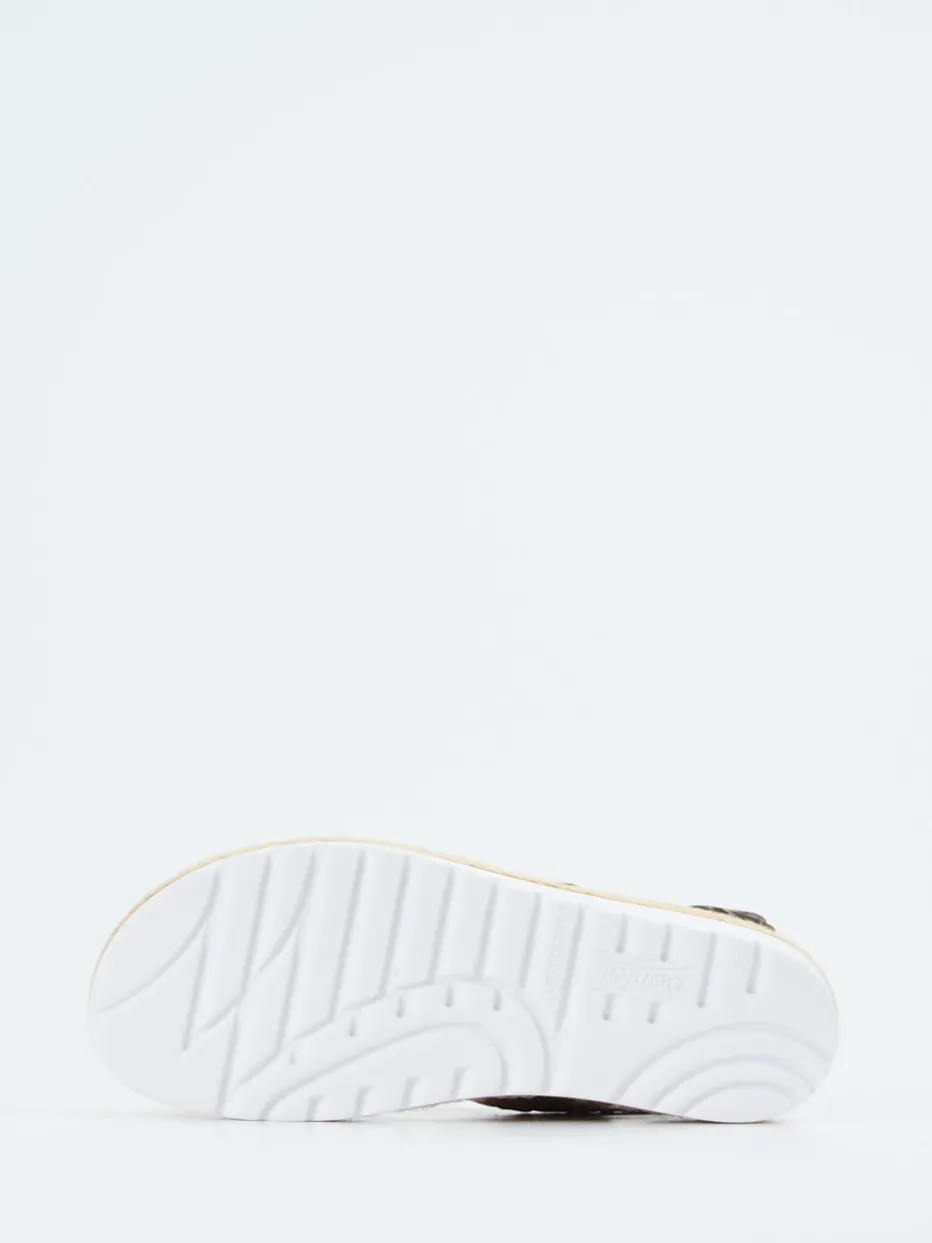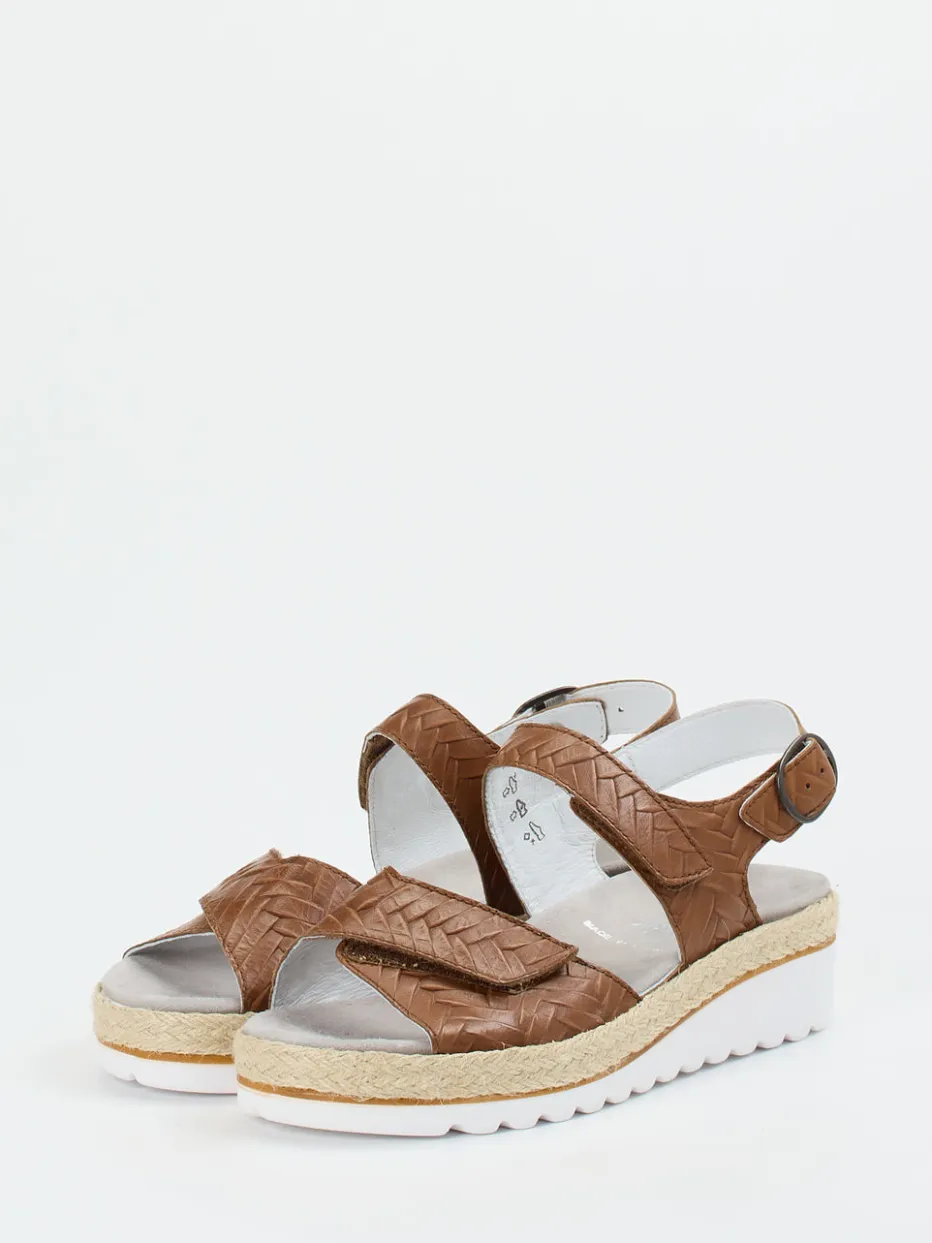 Diese Komfortsandale vereint ergonomische Form mit natürlichen Akzenten in Bastoptik – ideal für entspannte Sommertage. Durch Klett und Schnalle individuell anpassbar.