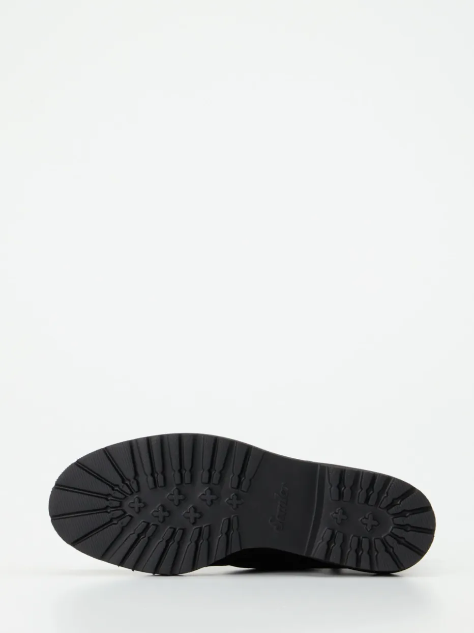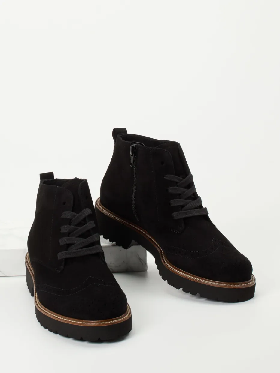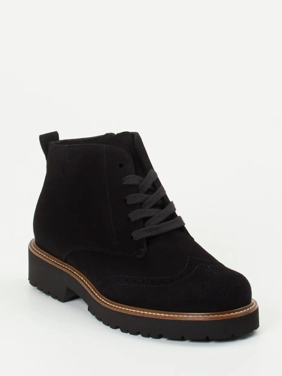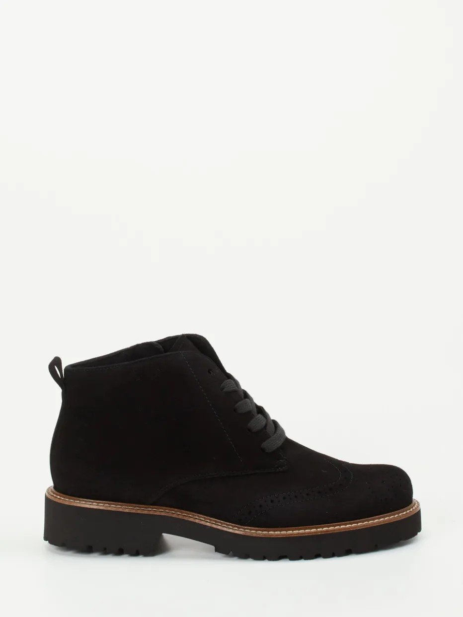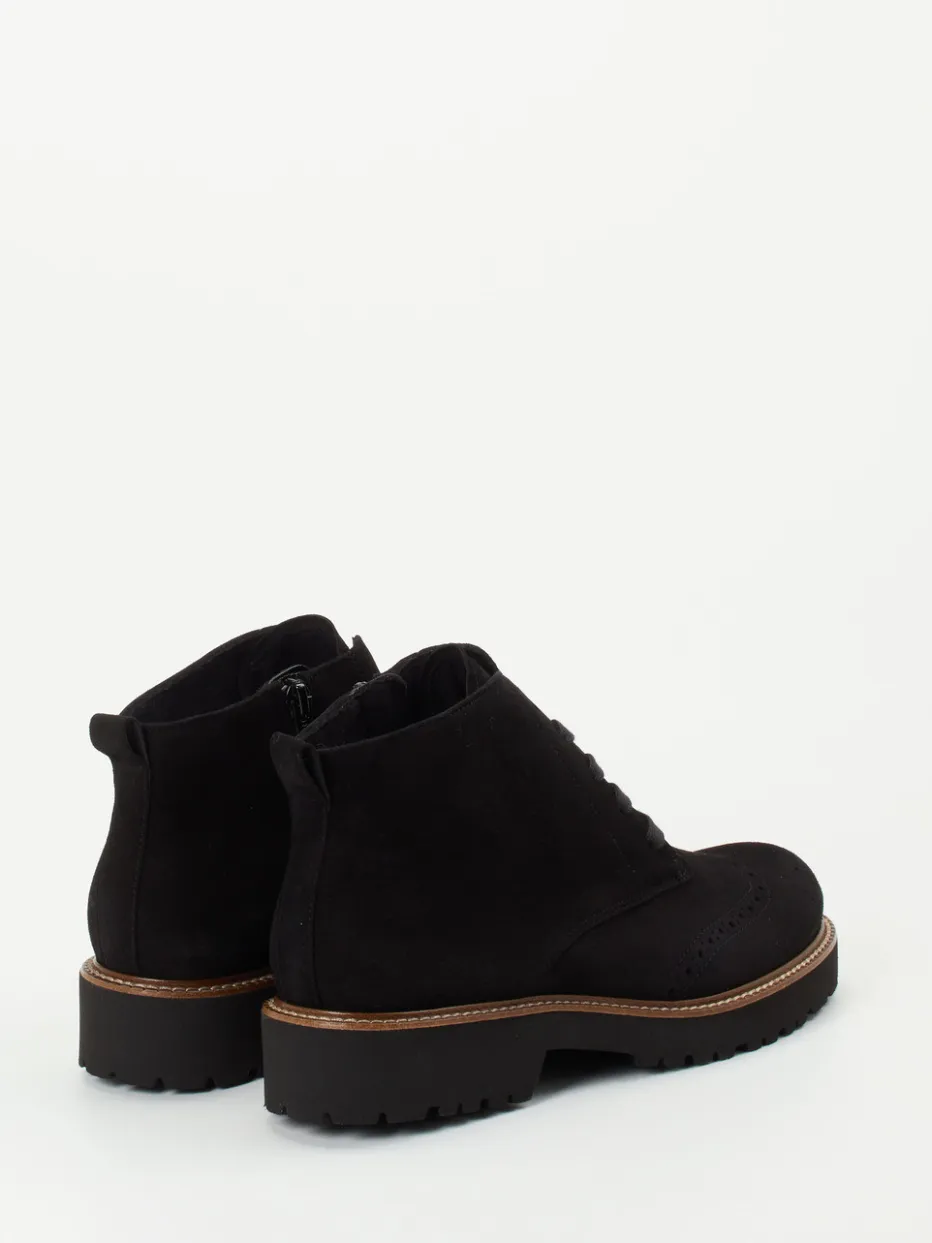 Ideal für wechselhafte Tage in der Stadt, setzen diese Damen-Boots auf schwarzes Veloursleder, das samtig-matt erscheint und durch feine Lochstanzung sowie tonige Nähte veredelt wird. Die knöchelhohe Silhouette mit rund zulaufender Front bietet, Dank Innenreißverschluss, komfortablen Einstieg und sicheren Halt. Die tief profilierte Gummisohle mit hellem Rahmen sorgt für Trittsicherheit bei gleichzeitig modischer Aussage. Die Weite H sowie das herausnehmbare Fußbett unterstützen Fußkomfort auch bei langem Tragen. Ein ausbalancierter Mix aus Heritage-Flair und Utility-Trend.