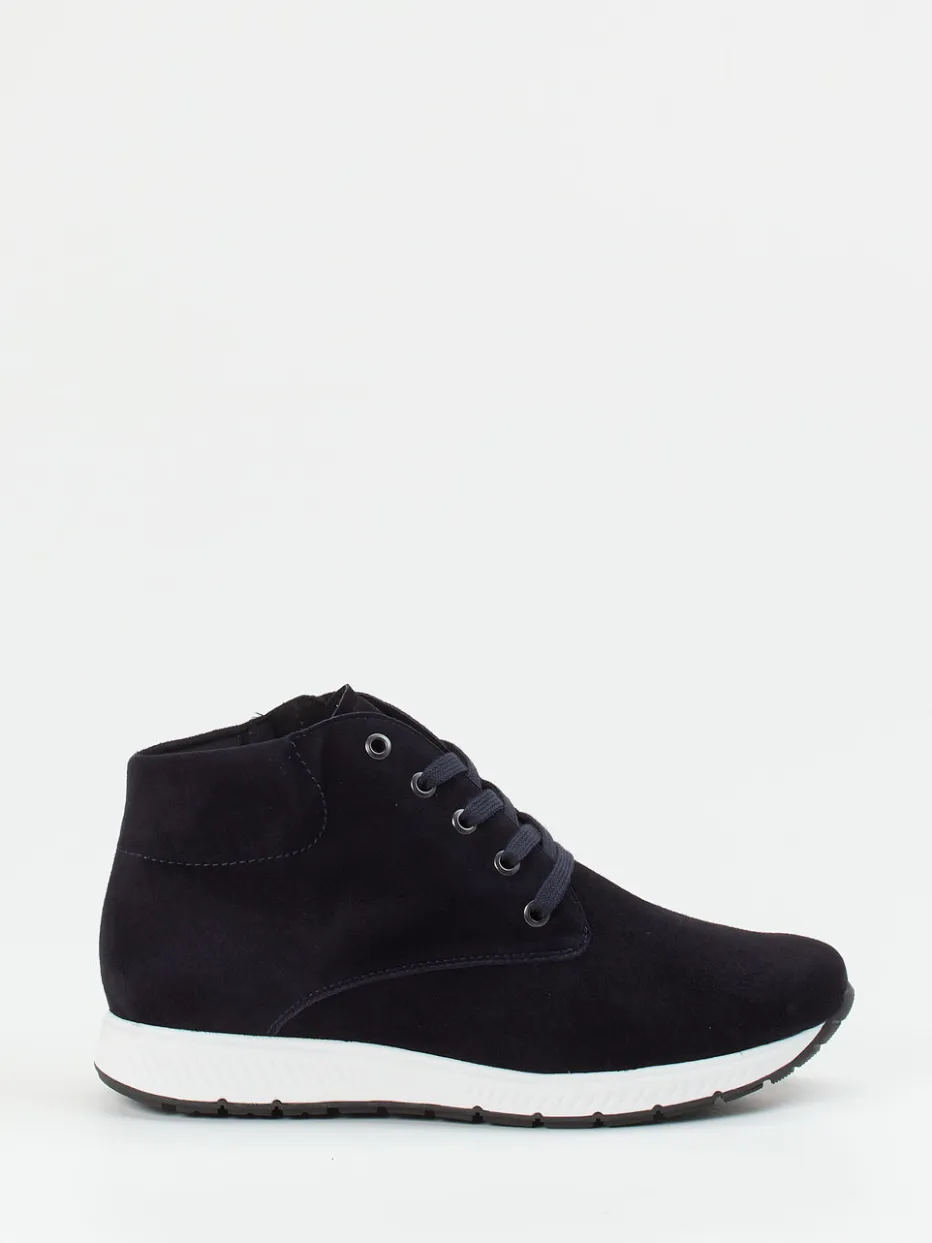 Ideal für entspannte Alltagssituationen, vereinen diese Boots mitternachtsblaues Veloursleder – samtig matt strukturiert – mit schlanker, knöchelhoher Silhouette. Schnürung und innenliegender Reißverschluss erleichtern das Anpassen und Anziehen. Eine weiße Profilsohle mit Luftpolsterung sorgt für gelenkschonenden Komfort. Details wie schwarze Ösen und Ton-in-Ton-Nähte unterstreichen den reduzierten Look. Eine komfortorientierte Wahl für casual-orientierte, trendbewusste Trägerinnen. Kombiniert mit Steppjacken und Jogpants entsteht ein moderner Urban-Relax-Stil.