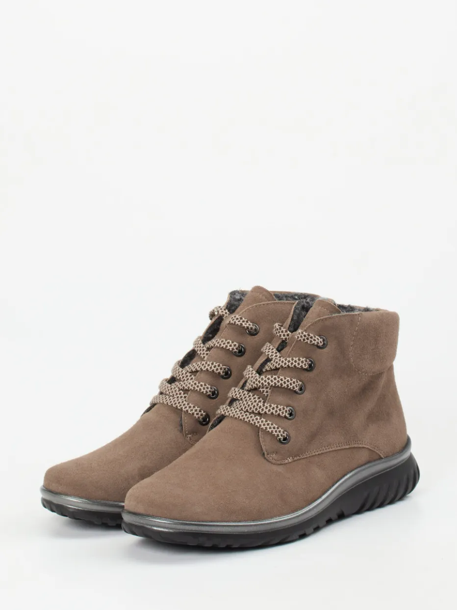Ob beim Stadtbummel oder auf einem Spaziergang in der Natur – der knöchelhohe Boot aus taupefarbenem Veloursleder mit samtiger Haptik bietet dank Teddy-Innenfutter hervorragende Wärmeisolierung. Der seitliche Reißverschluss erleichtert das An- und Ausziehen, während eine beige-braune Kordelschnürung und anthrazitfarbene Ösen den minimalistischen Outdoor-Look abrunden. Die silberfarbene Sohlenumrandung setzt ein dezentes Design-Statement. Die PU-Laufsohle mit Profil sowie das austauschbare Vario-Fußbett unterstreichen den funktionalen Anspruch des Modells.