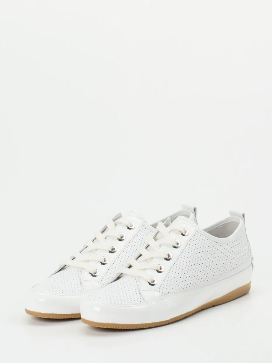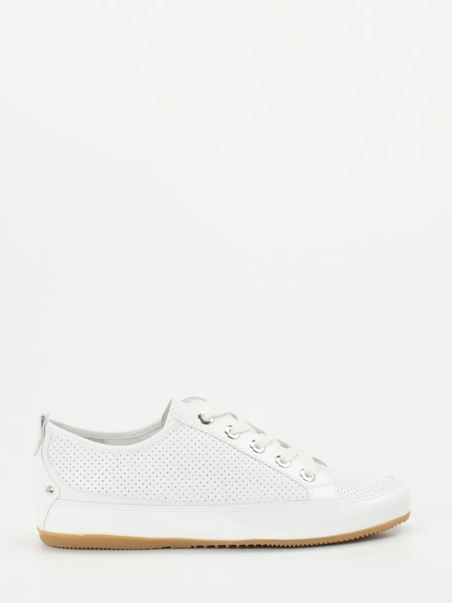 Leichtigkeit trifft auf subtile Eleganz.Semler präsentiert diesen Low-Top Damen-Sneaker als idealen Begleiter für entspannte Sommermomente. Er passt sich Alltagssituationen mit Leichtigkeit an – vom Spaziergang in der Stadt bis zum Müßiggang auf der Terrasse. Gefertigt aus weichem Kalbleder mit glänzenden Lackleder-Akzenten, überzeugt das Modell durch eine perforierte Oberfläche, die sommerliche Atmungsaktivität ermöglicht. Die weiße Grundfarbe wird durch silberfarbene Ösen, breite Satin-Schnürsenkel und eine rutschfeste Gummisohle in Kontrastoptik ergänzt. Die klassische Silhouette mit Zuglasche steht für schlichte Eleganz. Modisch einzuordnen im Clean Sneaker Trend SS24, ideal zu Leinenhose oder Sommerkleid. Mit herausnehmbarem Fußbett für Einlagen und komfortgenauer Weite G – made for quiet sophistication.