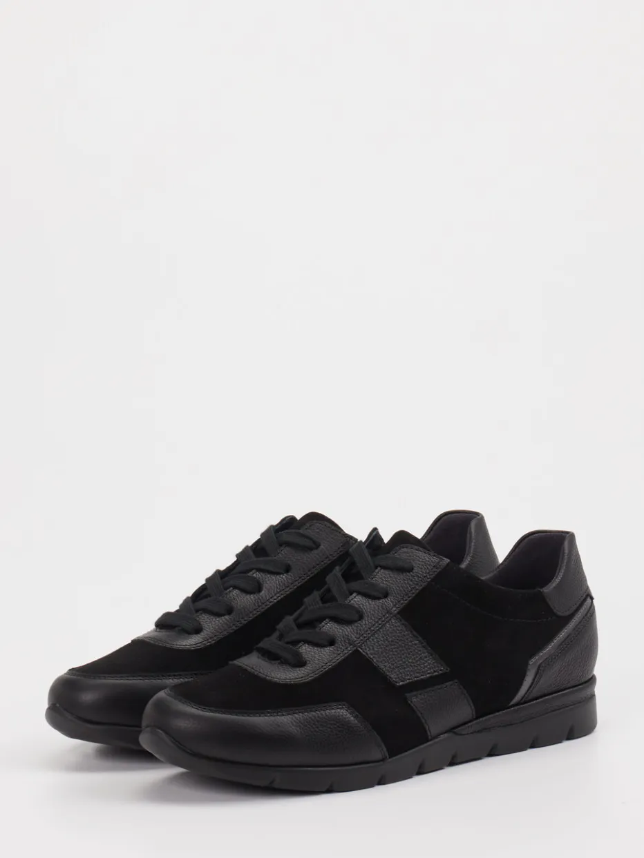 Schwarz trifft auf Strukturtiefe. Der Damen-Sneaker von Semler überzeugt als stilbewusster Begleiter für Alltag und Freizeit. In monochromem Schwarz zeigt sich dieser Komfortsneaker mit einem hochwertigen Mix aus glattem und samtigem Leder, was für interessante Materialkontraste sorgt. Die klassische, flache Form, eine profilierte PU-Laufsohle und der gepolsterte Schaftrand unterstreichen den funktionalen Komfortanspruch. Dank Schnürung sichert der Schuh optimalen Halt, das Textil-Leder-Futter rundet das Tragegefühl ab. Die Ton-in-Ton-Optik und die ruhige Linienführung betonen den „Quiet Luxury“-Trend – ideal für minimalistische Looks. Mit herausnehmbarer Innensohle bietet er zusätzlichen Komfort im Stil von Semler.