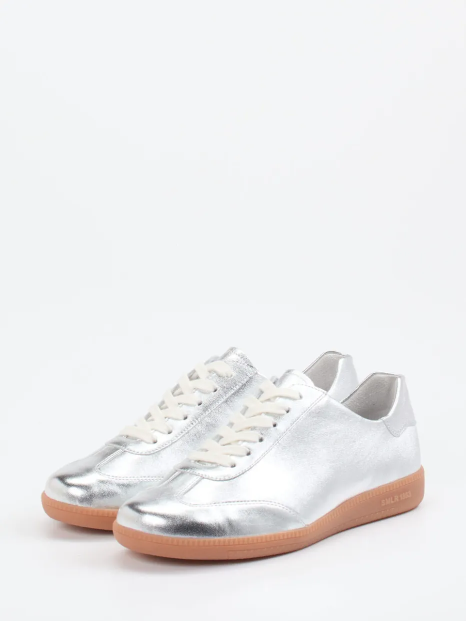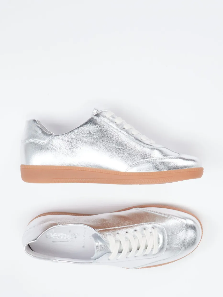 Ob zum Stadtbummel oder zum Ausgehen: Das butterweiche Metallicleder in glänzendem Silber unterstreicht den modischen Anspruch dieses Sneakers. Die klassische, flache Silhouette wird durch cremeweiße Schnürsenkel und eine kontrastierende, rutschfeste Gummisohle mit Logo geprägt. Innen sorgt ein weiches Leder-/Textilfutter für Komfort, während das gepolsterte Wechselfußbett ideal für Einlagen geeignet ist. Inspiriert von Streetwear und Minimalismus, passt das Modell perfekt zu oversized Denim oder Metallic-Accessoires.