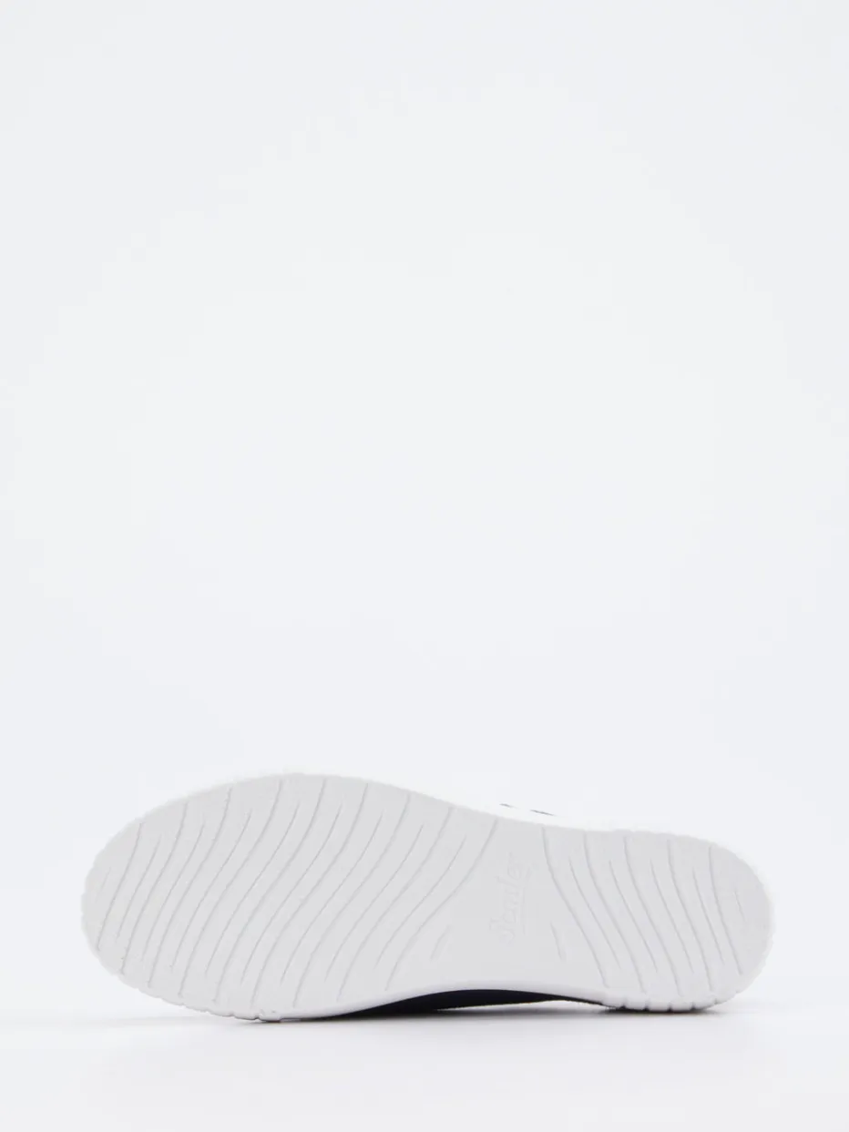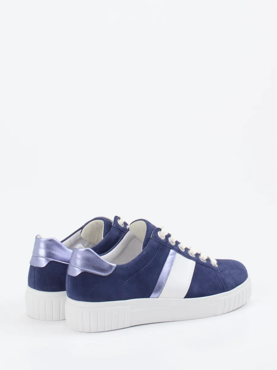 Komfort mit Stilfaktor.Semler präsentiert einen stilbewussten Damen-Sneaker mit sportivem Anspruch. Ideal für entspannte Tage und stilvolle Casual-Outfits überzeugt dieses Modell mit einer Basis aus blauem Nubukleder, das samtig angeschliffen ist. Weiße Details und metalliclavendelfarbene Akzente setzen lebendige Highlights und greifen aktuelle Trendthemen wie Color-Blocking und Metallic Accents auf. Die rundliche Low-Top-Silhouette mit Schnürung, profilierter Gummisohle und gepolsterter Ferse sorgt für einen bequemen, sicheren Tritt. Perfekt in Kombination mit Cropped Jeans oder pastellfarbenen Accessories. Ein Allrounder mit sportlicher Leichtigkeit und femininem Finish – typisch Semler.