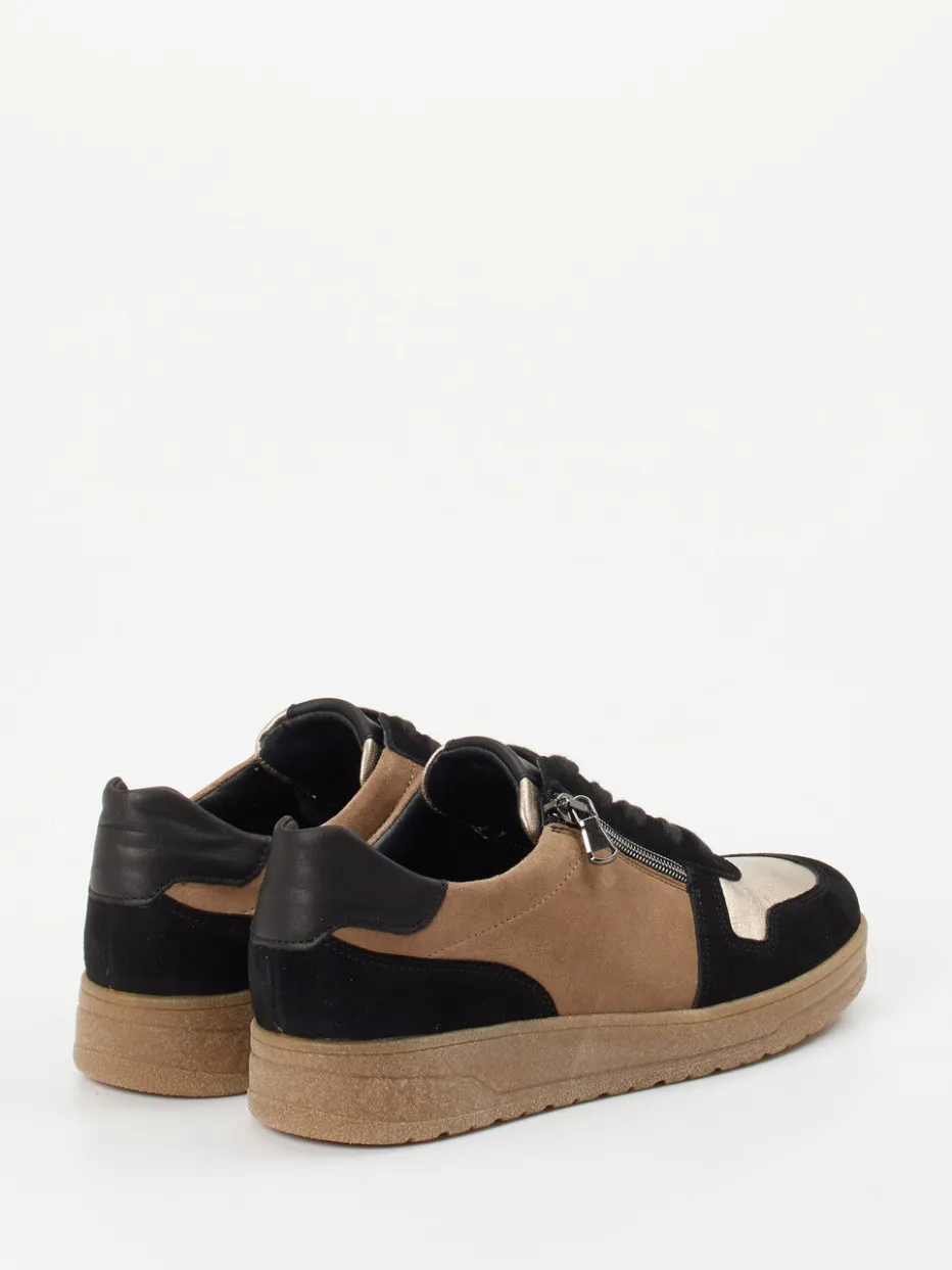 Stilvoller Komfort für jeden Tag.Semler präsentiert einen Damen-Sneaker, der modischen Anspruch und angenehmen Tragekomfort verbindet. Für entspannte Freizeitmomente bietet dieser Low-Top-Sneaker in Cognacbraun mit schwarzen und metallic-goldenen Akzenten eine gelungene Kombination aus Stil und Bequemlichkeit. Veloursleder mit samtiger Oberfläche trifft auf feine Glattlederdetails und glänzende Highlights. Die runde Silhouette wird durch Schnürung und seitlichen Reißverschluss ergänzt. Die profilierte Gummisohle sorgt für Trittsicherheit, das austauschbare Fußbett unterstützt individuellen Komfort. Inspirierend im Streetwear-Stil, mühelos kombinierbar mit Casual-Looks. Klare Funktionalität trifft bei Semler auf zeitgemäße Retro-Eleganz.