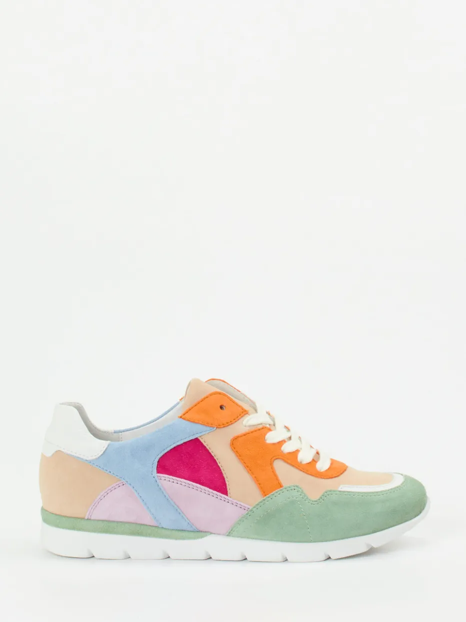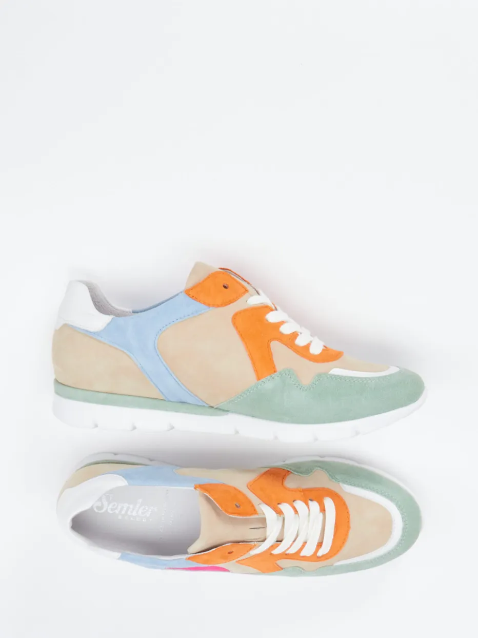 Frische Farben für entspannte Tage.Semler präsentiert mit diesem Low-Top-Sneaker ein modisches Damenmodell voller Lebendigkeit. Ideal für Spaziergänge durch die Stadt oder entspannten Urlaubslifestyle überzeugt das Paar mit weichem Veloursleder, samtig angeschliffen, sowie einer flexiblen Gummisohle mit Luftpolsterung. Das Colorblocking-Design kombiniert zarte Pastellnuancen wie Apricot-Beige, Mintgrün oder Flieder mit kräftigem Pink und Orange. Der gepolsterte Einstieg und die austauschbare Innensohle sorgen für angenehmen Tragekomfort. Die klassische Schnürung in Weiß unterstreicht den sportlich-retrohaften Charakter. Besonders harmonisch zu weißen Jeans oder luftigen Kleidern. Federleichtes Laufgefühl mit funktionaler Raffinesse – wie gemacht für stilvolle Bewegung.