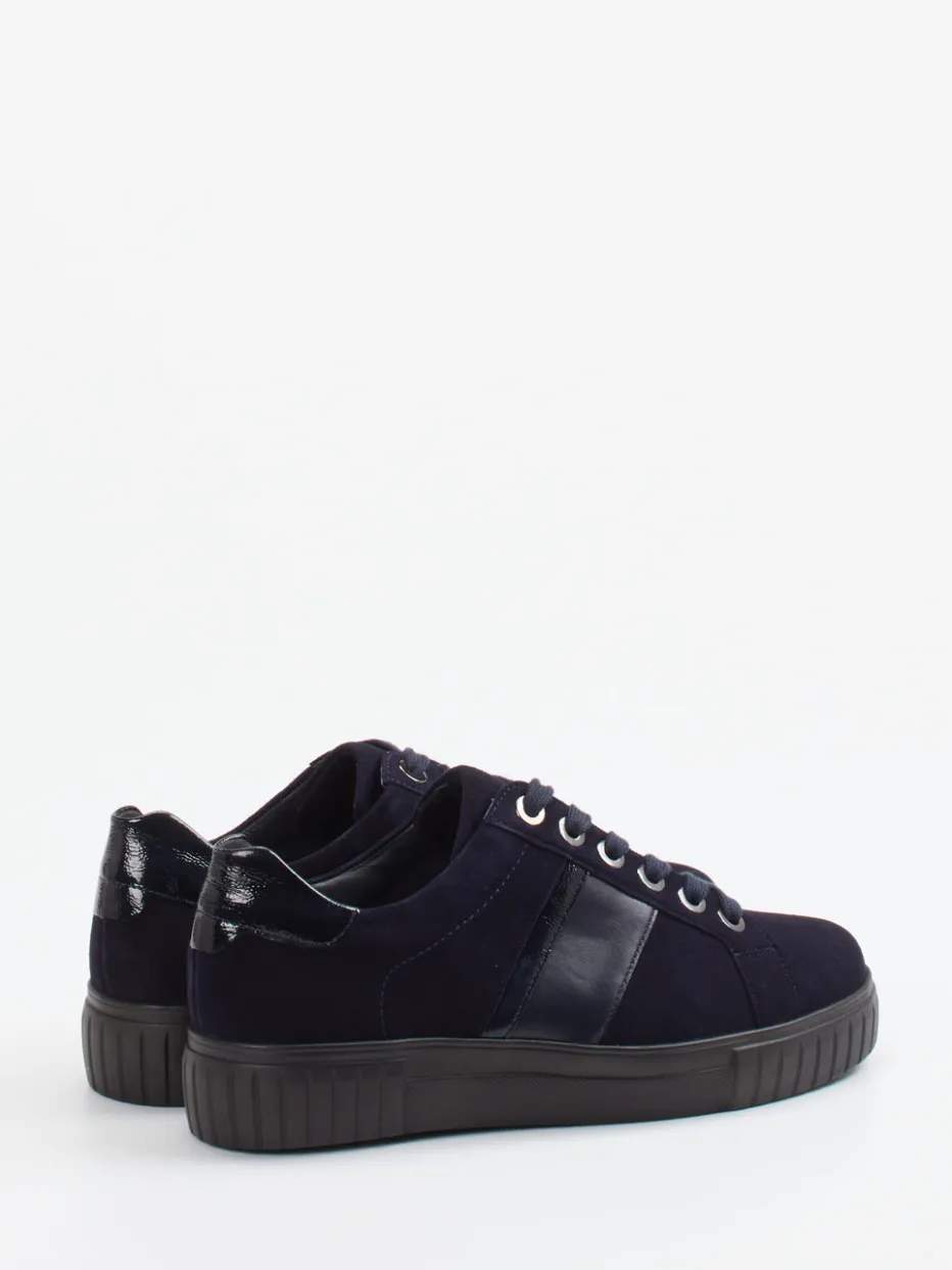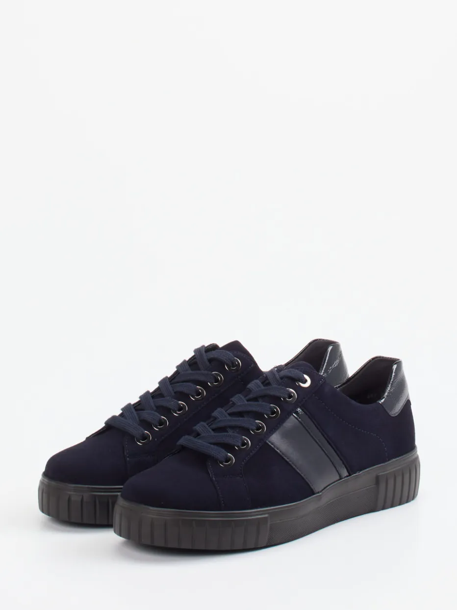 Ob im Büro oder in der Freizeit – die dunkelblaue Farbgebung mit anthrazitfarbenen Akzenten fügt sich mühelos in monochrome Looks ein. Die matt strukturierte Oberfläche aus Veloursleder wird ergänzt durch glänzende Partien an der Ferse und an den Seitenstreifen sowie Metallösen zur Schnürung. Das klassische Runddesign, ein Leder-Textilfutter und die gepolsterte Fersenkappe bieten angenehmen Tragekomfort. Ein herausnehmbares Fußbett und eine rutschhemmende Profilsohle unterstreichen die Alltagstauglichkeit. Passt hervorragend zu dunkelblauen Hosen oder Taschen.
