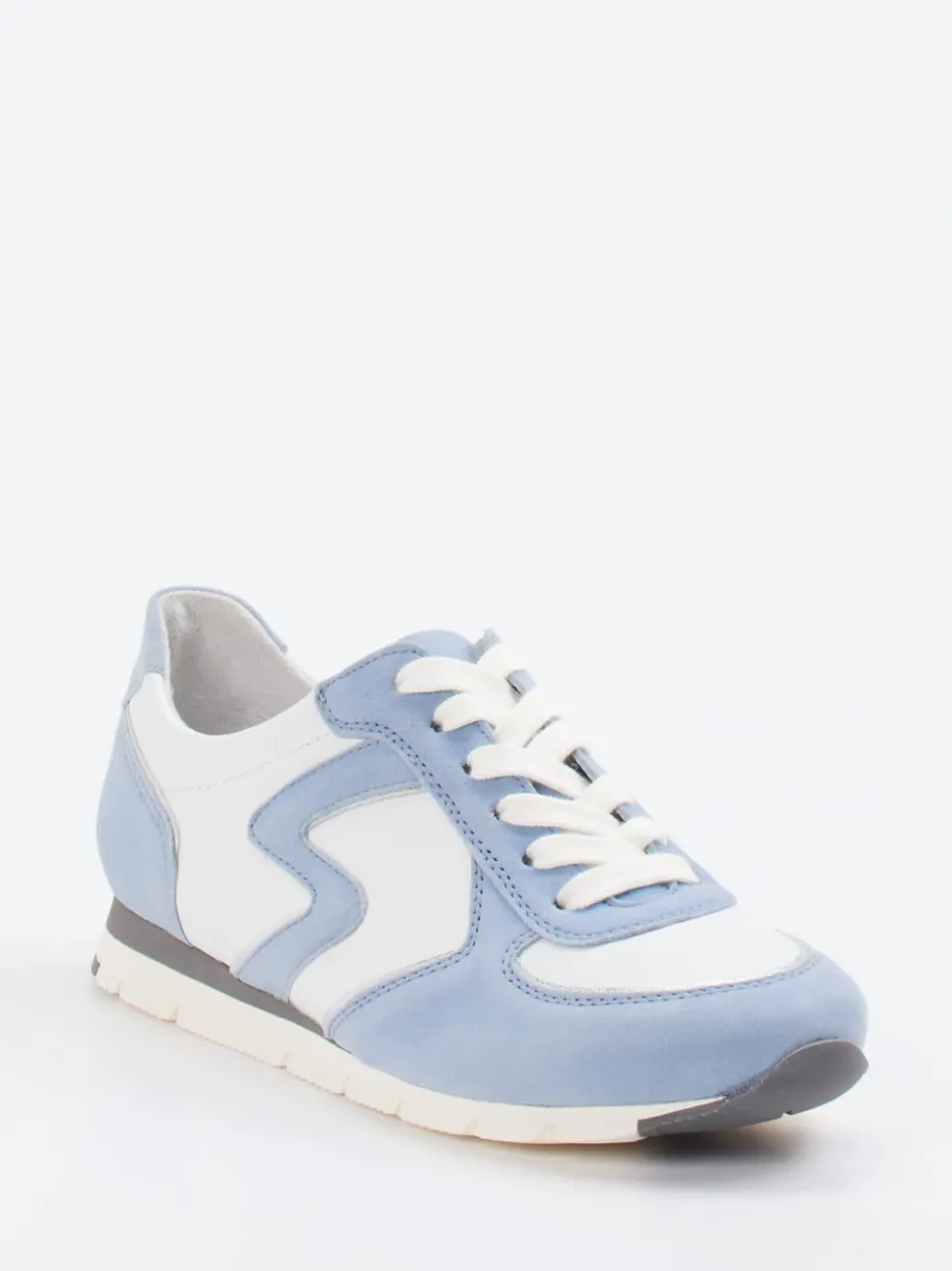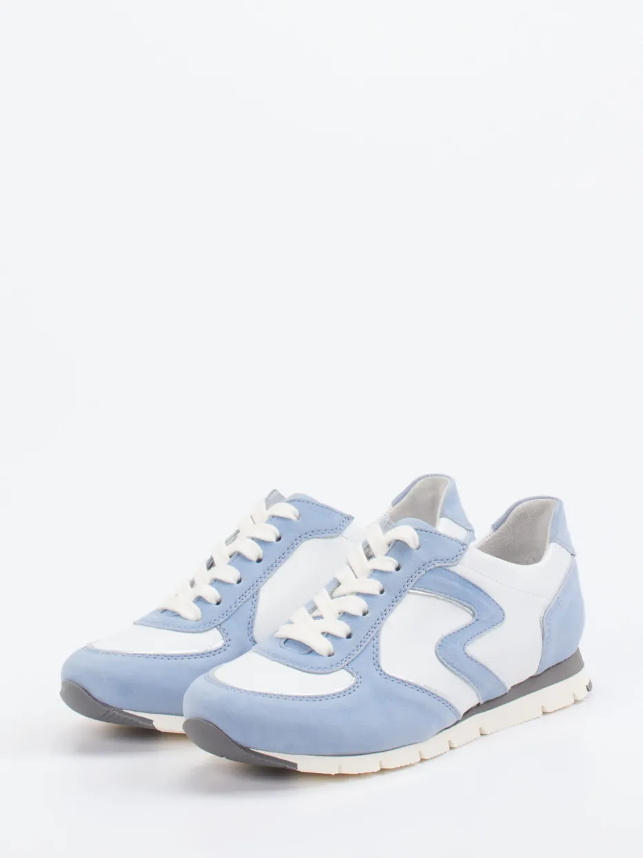 Ob beim Stadtbummel oder auf Reisen – das Modell überzeugt mit weichem Veloursleder, ergänzt durch glatte Lederpartien und ein atmungsaktives Leder-/Textilfutter. Die weiße Grundfarbe mit hellblauen Akzenten bringt frischen Pastell-Charme. Eine flach gehaltene, zweifarbige Gummisohle sowie die flexible Schnürung sorgen für Komfort und Stabilität. Geprägt vom Streetwear-Trend mit Vintage-Twist, passt dieser Sneaker perfekt zu entspannten Casual-Looks wie Jeansjacke und Crossbody-Bag.