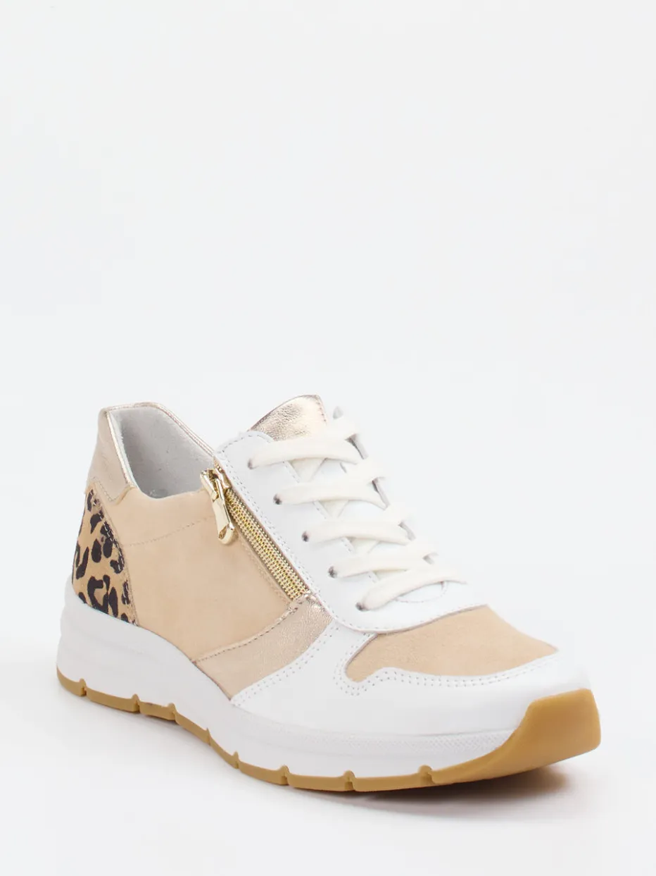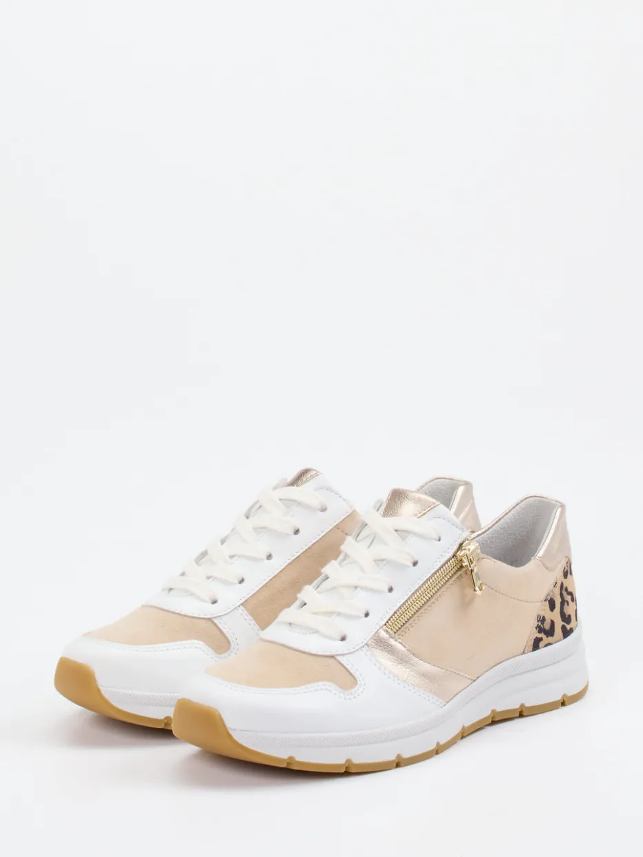 Komfort trifft Trendakzente.Semler interpretiert den klassischen Damen-Sneaker neu und verbindet Komfort mit modischem Anspruch. Der sportlich-kompakte Sneaker überzeugt im Alltag durch seine gelungene Materialkombination: weiches beiges Veloursleder trifft auf weißes Kalbleder und goldfarbenes Metallicleder. Ein Fersenpatch im Leopardenmuster akzentuiert die Silhouette. Der seitliche goldene Reißverschluss ermöglicht bequemes Anziehen, während die PU-Luftpolstersohle mit rutschhemmendem Gummiprofil für Trittsicherheit sorgt. Der Schuh eignet sich bestens für den Alltag – oder als stylisches Statement bei entspannten Freizeitaktivitäten. Besonders harmonisch wirkt die Kombination mit beigen Taschen oder goldfarbenen Accessoires. Ein Komfort-Sneaker, der Design und Bequemlichkeit harmonisch vereint.
