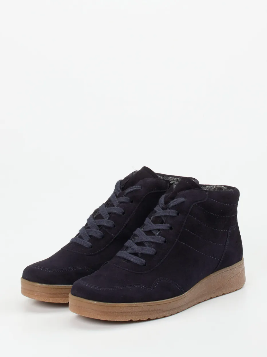 Warmer Komfort trifft urbanen Minimalismus.Semler präsentiert knöchelhohe Sneaker-Boots für Damen mit durchdachtem Komfort. Ideal für kalte Herbsttage im Stadtalltag: Das nachtblaue Veloursleder zeigt sich matt und samtig, ergänzt durch tonige Schnürung und dezente Steppnähte. Der Innenreißverschluss erleichtert den Einstieg, während das synthetische Weblammfutter angenehm wärmt. Eine profilierte Gummisohle sorgt für sicheren Halt auf nassem Untergrund. Das minimalistische Design passt perfekt zu Streetwear-inspirierten Casual-Looks. Ein rundum gelungener Wohlfühl-Schuh mit langlebigem Tragegefühl – typisch Semler.