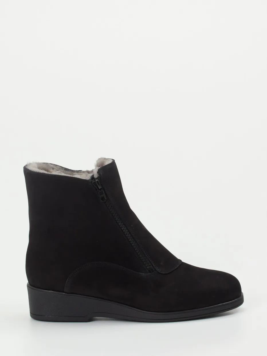 Wärmender Komfort für den Winter.Semler präsentiert eine Damen-Stiefelette für kalte Tage. Ob beim Winterspaziergang oder im Alltag – die schwarze Stiefelette aus samtig angeschliffenem Nubukleder bietet zuverlässige Wärme dank ihres natürlichen Lammfellfutters. Der knöchelhohe Schnitt mit beidseitigen Reißverschlüssen sorgt für hohen Komfort beim An- und Ausziehen. Die dezente Optik mit Ton-in-Ton-Nähten und matter Oberfläche passt zum minimalistischen Quiet-Luxury-Stil. Die rutschhemmende Gummisohle mit leichtem Keilabsatz vereint Stabilität mit dezentem Schick. Ideal zu Thermoleggings und Wollmantel. Semler steht für orthopädische Expertise mit modischer Finesse.