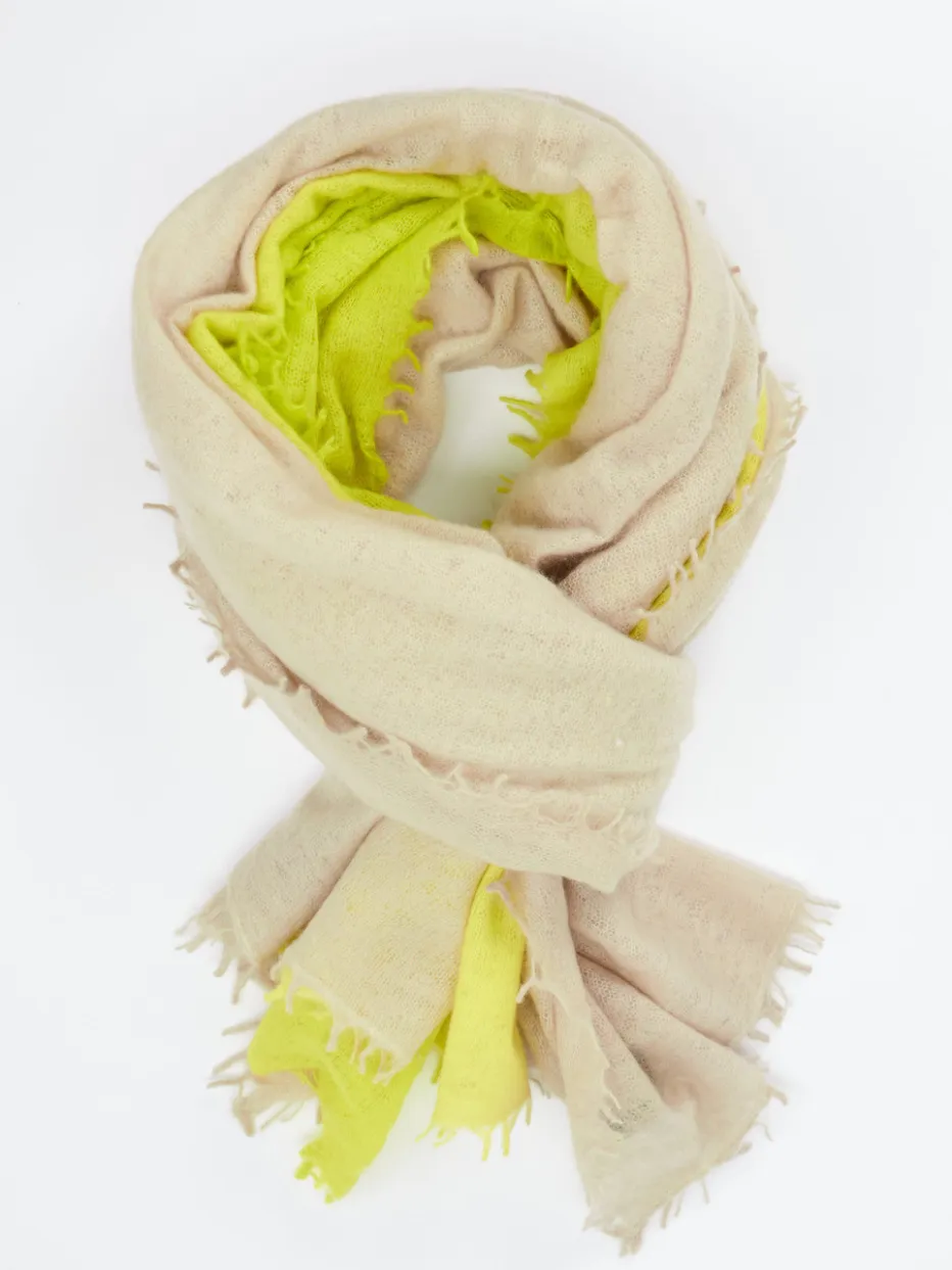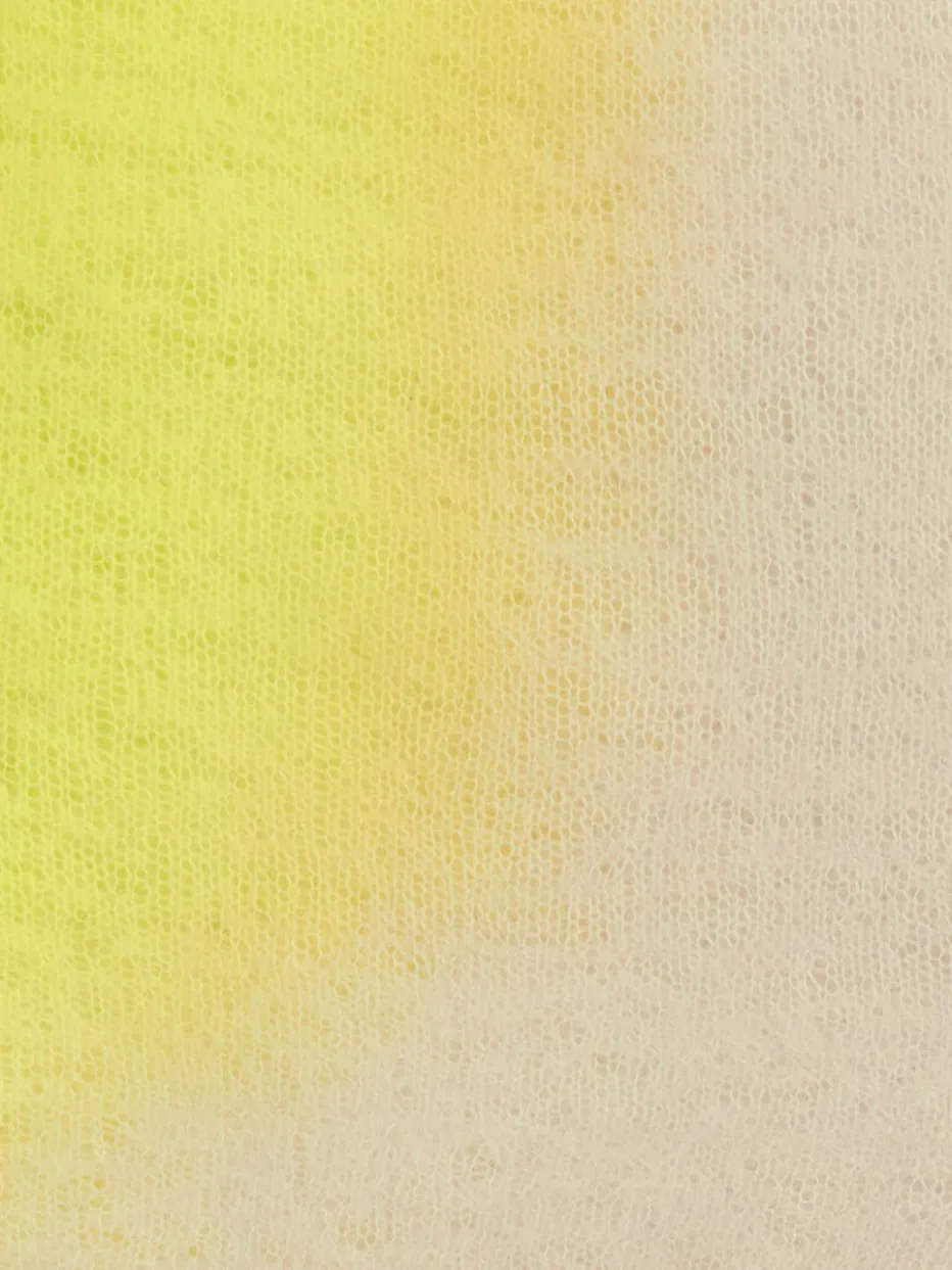 Luxuriöser Schal aus 100 % Kaschmir mit floriger Textur, der mit einem erfrischenden Farbverlauf von Beige zu Neongelb sommerliche Akzente setzt.