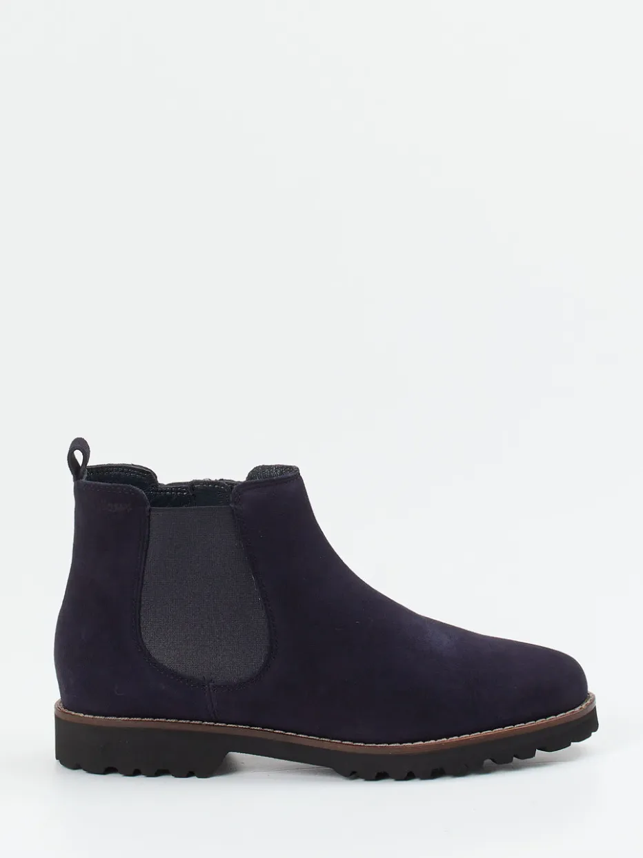 Gefertigt aus geschmeidigem Veloursleder mit samtiger Oberfläche zeigt sich die Chelsea-Stiefelette in einem tiefen Dunkelviolett. Der klassische Schaft mit Zuglasche und Elastikeinsätzen wird durch einen innenliegenden Reißverschluss ergänzt, die rutschhemmende Profilsohle sorgt für urbanen Grip. Dezente Kontrastnähte und der braune Rahmen runden das urbane Design ab.