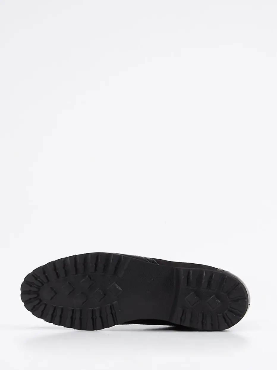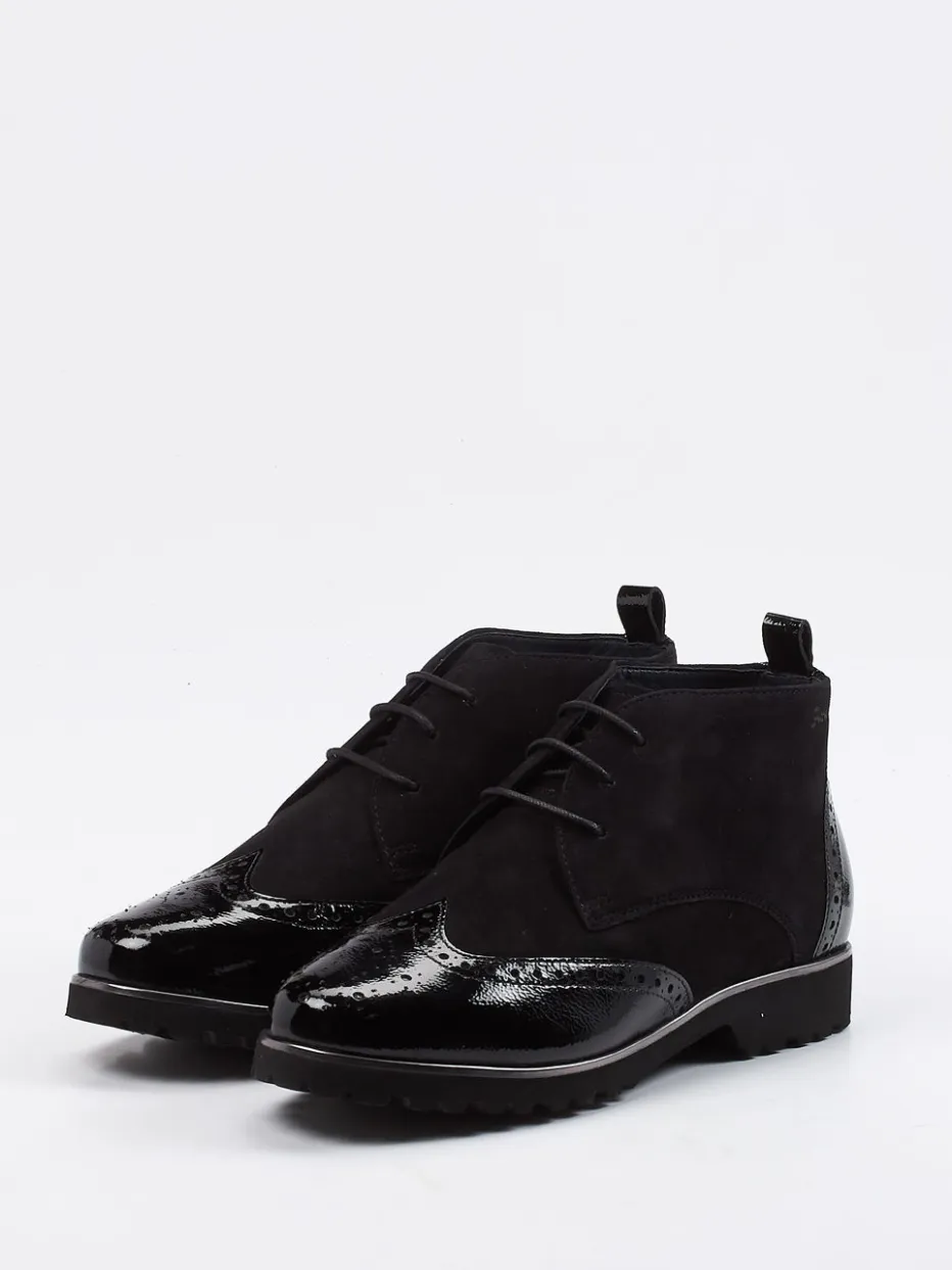 Moderner Brogue-Charakter mit Komfort.Die Marke Sioux präsentiert stilvolle Desert Boots für Damen. Ideal für Büro und Freizeit: Diese knöchelhohen Schnürschuhe zeigen einen gelungenen Materialmix aus schwarzem Veloursleder und glänzenden Lackakzenten mit klassischer Brogue-Perforation. Die matt-glänzende Oberfläche wirkt zeitlos und urban. Eine griffig profilierte Gummisohle sorgt für Trittsicherheit, das weich gepolsterte Wechselfußbett lässt sich leicht gegen individuelle Einlagen tauschen. Dezente Ziernähte und eine rückseitige Zuglasche runden das Design funktional ab. Optimal kombinierbar mit Wollmantel und Ledertasche. Ein Heritage-inspirierter Bequemschuh mit urbanem Anspruch – typisch Sioux.