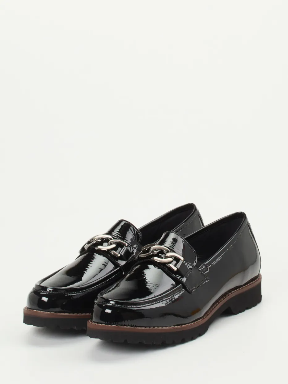 Dieser Loafer verbindet hochglänzendes Lackleder mit einer silberfarbenen Kettenspange und betonter Profilsohle zu einem stilvollen Begleiter für Business und Alltag.