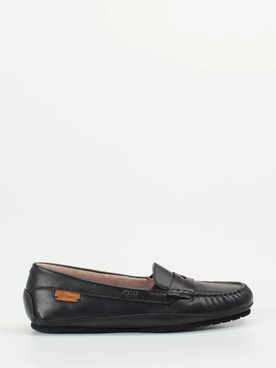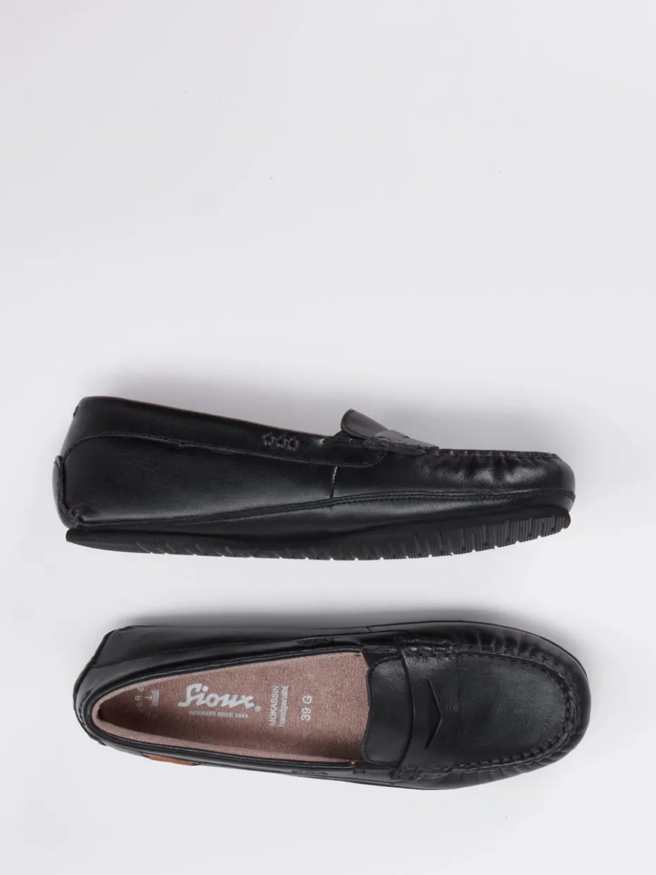 Klassik modern gedacht.Sioux präsentiert mit diesem Mokassin ein elegantes Modell für Damen. Für gepflegte Alltagsmomente oder das Büro kombiniert der flache Schlupfschuh edles schwarzes Kalbleder mit einer matten Oberfläche und tonigen Ziernähten. Ein geprägtes Markenlogo auf einem seitlichen Patch und die schmal gehaltene Form unterstreichen den klassischen Charakter mit moderner Note. Die flexible Gummisohle sorgt für angenehmes Laufgefühl, das Textilfutter aus Frottee steigert den Tragekomfort. Stilistisch passt der Schuh optimal in klassische und komfortorientierte Garderoben – ein passender Begleiter zu Stoffhosen und monochromen Looks. Verlässlicher Komfort mit zeitloser Formsprache – typisch Sioux.