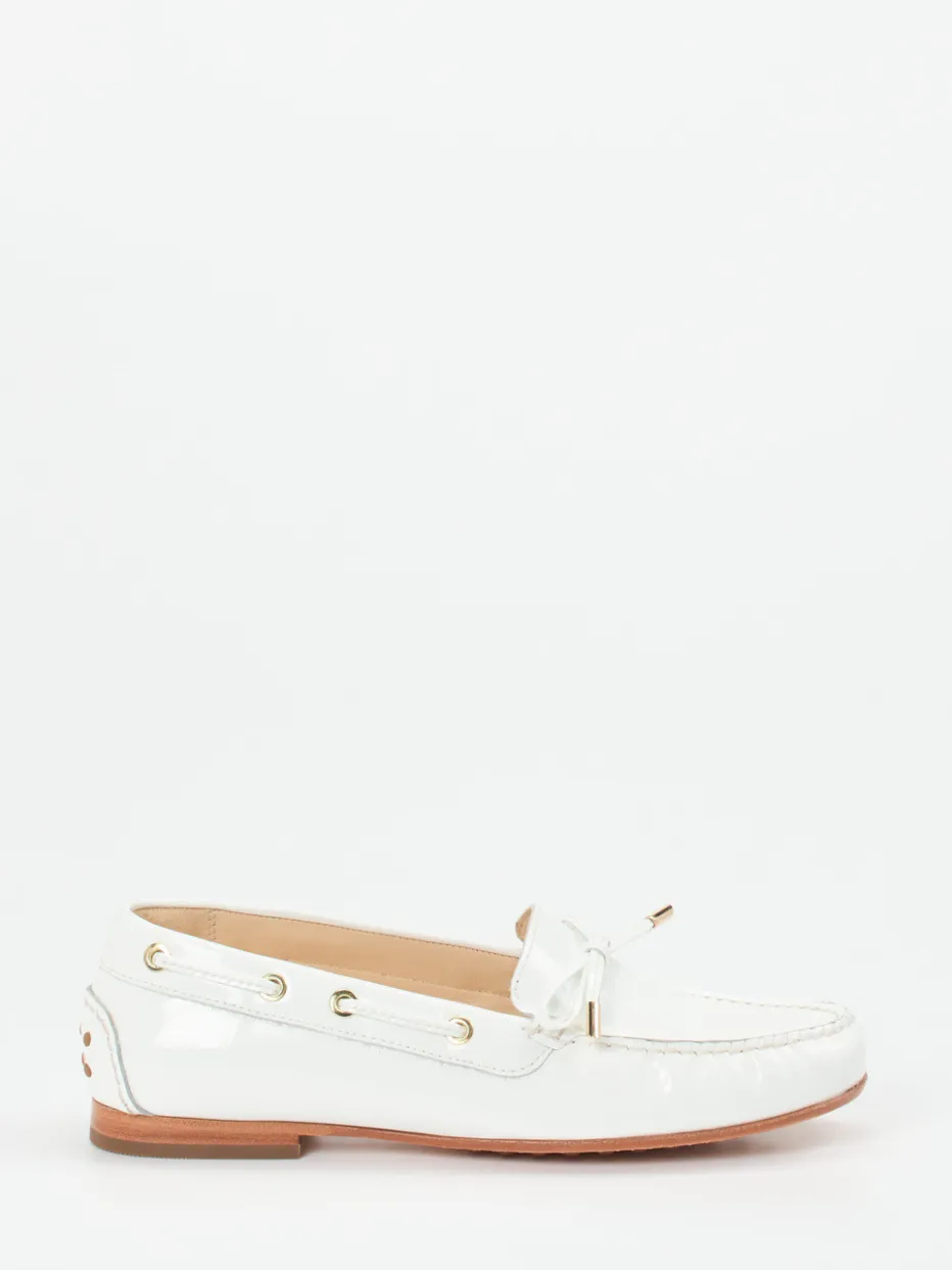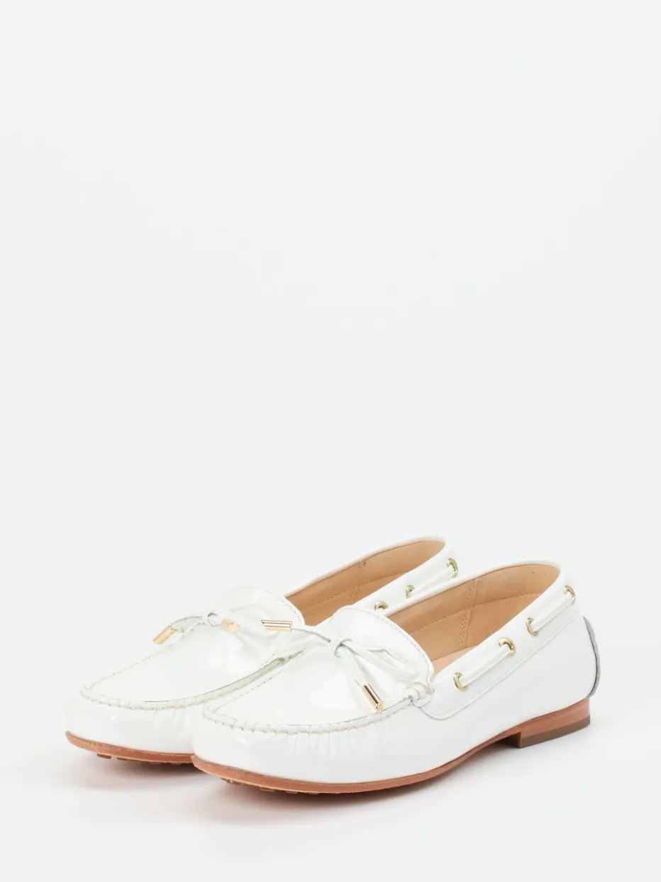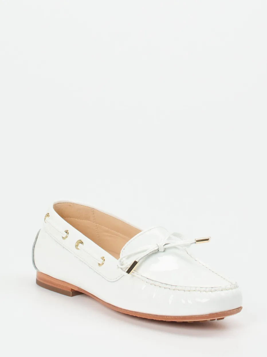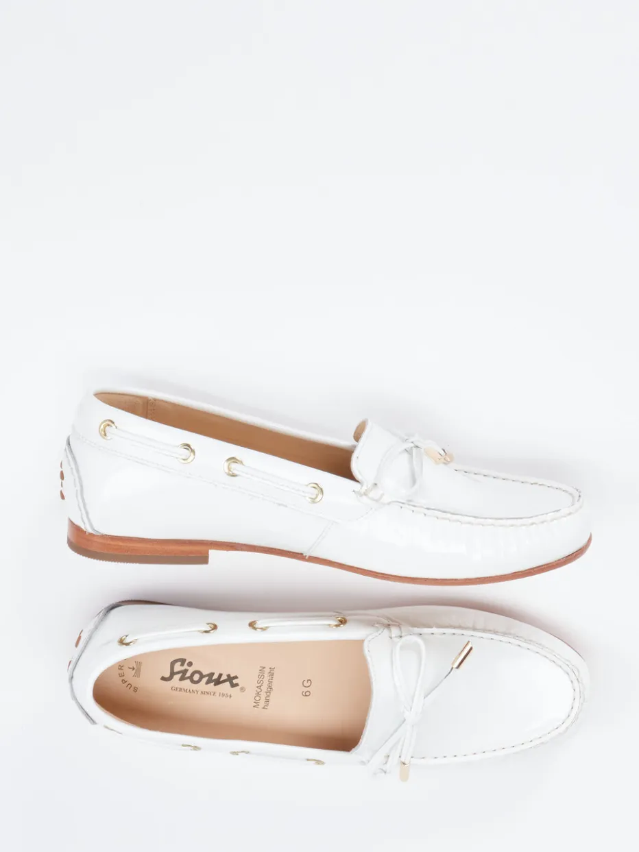 Eleganz trifft auf Alltagstauglichkeit.Der Mokassin von Sioux für Damen präsentiert sich als stilvoller Slipper in klassischer Preppy-Optik. Ideal für Büro und Freizeit: Das glänzende, weiße Lamm-Lackleder verleiht dem Modell Leichtigkeit und Sommer-Charme. Handgenähte Mokassin-Nähte und eine goldakzentuierte Zierschnürung sorgen für ein raffiniertes Finish. Das weiche Leder-Innenfutter und ein austauschbares Softfußbett bieten besonderen Komfort. Dank gummierter Noppen unter der Ledersohle und an der Ferse wird auch die Funktionalität betont. Perfekt zu hellen Chinos oder leichten Sommerkleidern. Ein hochwertiger Begleiter im Zeichen stiller Eleganz – typisch Sioux.
