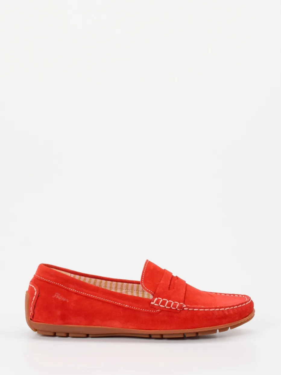 Sioux präsentiert mit diesem Slipper einen klassisch-flachen Damen-Mokassin in sommerlichem Korallrot.