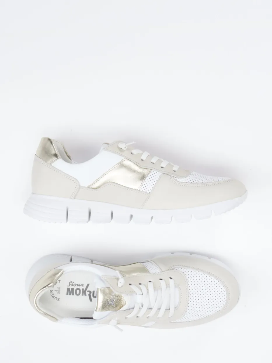 Sportiver Trend in Soft-Neutrals.Die Marke Sioux präsentiert mit diesem Sneaker ein Modell für Damen, das Minimalismus und Komfort vereint. Ideal für Freizeit, Reisen oder den Alltag in Bewegung: Das Modell kombiniert weiches Kalbleder mit perforierter Mesh-Oberfläche, ergänzt durch champagnergoldene Metallic-Einsätze. Die Farbpalette in Weiß und Beige wirkt hell und modern, die sportliche Silhouette erhält durch die klassische Schnürung und weich gepolsterte Elemente zusätzliche Komfortpunkte. Die griffige Gummisohle unterstützt ein sicheres Laufgefühl, während stilbewusste Akzente durch glänzende Details entstehen. Lässt sich hervorragend mit heller Denim oder Jogpants kombinieren. Eleganz, Tragekomfort und zeitgemäße Materialien – typisch Sioux.