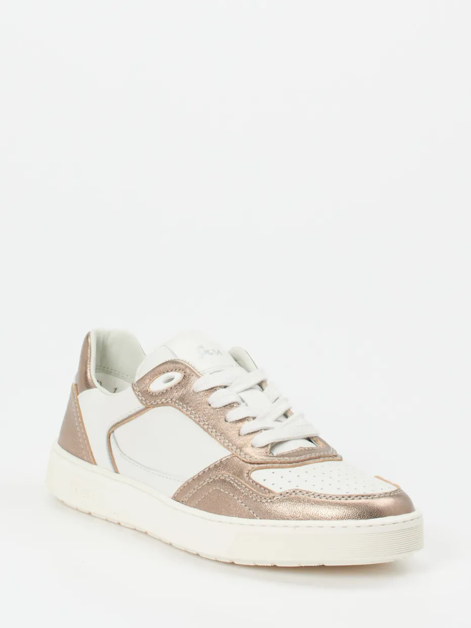 Roségold-Akzente in perfekter Balance.Der Damen-Sneaker von Sioux aus der „Maites Sneaker 001“ Kollektion verbindet Alltagstauglichkeit mit Fashion-Kompetenz. Für entspanntes Gehen an langen Tagen sorgt weiches Lammnappa, kombiniert mit einem atmungsaktiven Frottee-Innenfutter und gepolstertem Wechselfußbett. Die klassische Low-Top-Silhouette in Weiß wird durch roségoldene Metallic-Overlays stilvoll aufgewertet. Ton-in-Ton-Nähte und ein gepolsterter Schaftrand runden den Look ab. Dank rutschhemmender Gummisohle und California-Machart eignet sich der Schuh ideal für Büro und Freizeit. Feine Streetwear-Elemente treffen hier auf schlichte Eleganz. Sioux steht für passformorientiertes Design mit modischer Finesse.