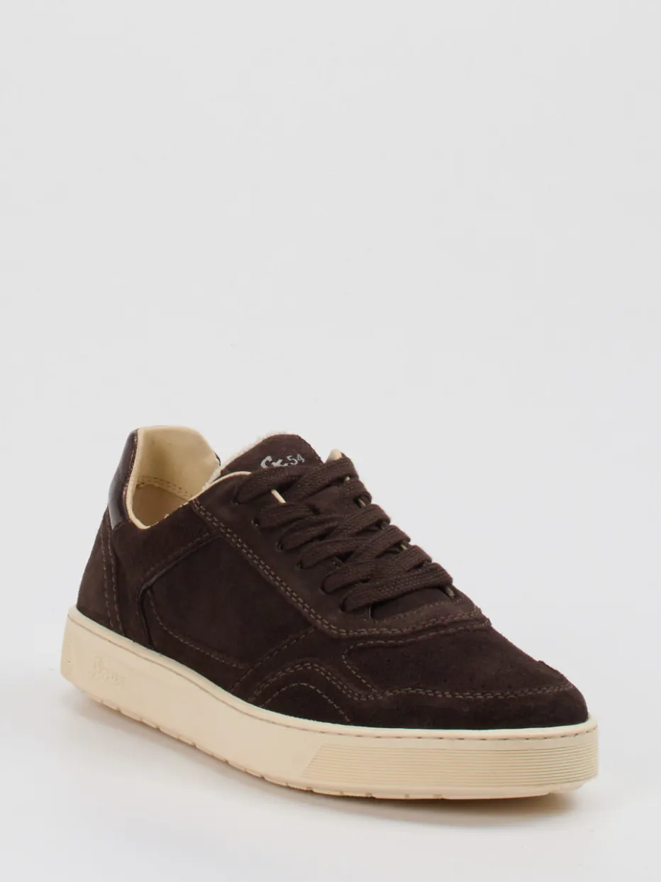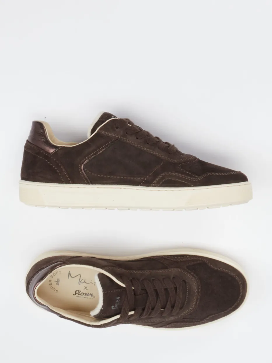 Warmer Komfort trifft dezentes Design. Sioux präsentiert mit diesem Low-Top-Sneaker ein Modell für stilbewusste Casual-Looks. In Alltagssituationen mit wechselhaften Temperaturen überzeugen die Sneaker dank samtig angeschliffenem Veloursleder und einem weichen Textilfutter in Lammfelloptik. Die dunkelbraune Oberfläche wirkt durch matte Struktur besonders edel, während kupferfarbene Fersenkappe und cremefarbene Kontrastsohle dezente Akzente setzen. Die klassische Silhouette mit gepolstertem Schaftrand und profilierter Gummisohle betont den sportiv-eleganten Charakter. Inspiriert von Retro-Sneakern und dem Quiet-Luxury-Trend, eignet sich das Modell ideal für Freizeit-Outfits mit Strick und Cord. Ein komfortbetonter Sneaker mit markentypischer Verarbeitungsqualität von Sioux.