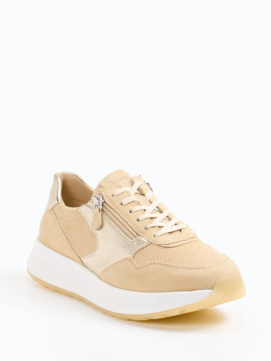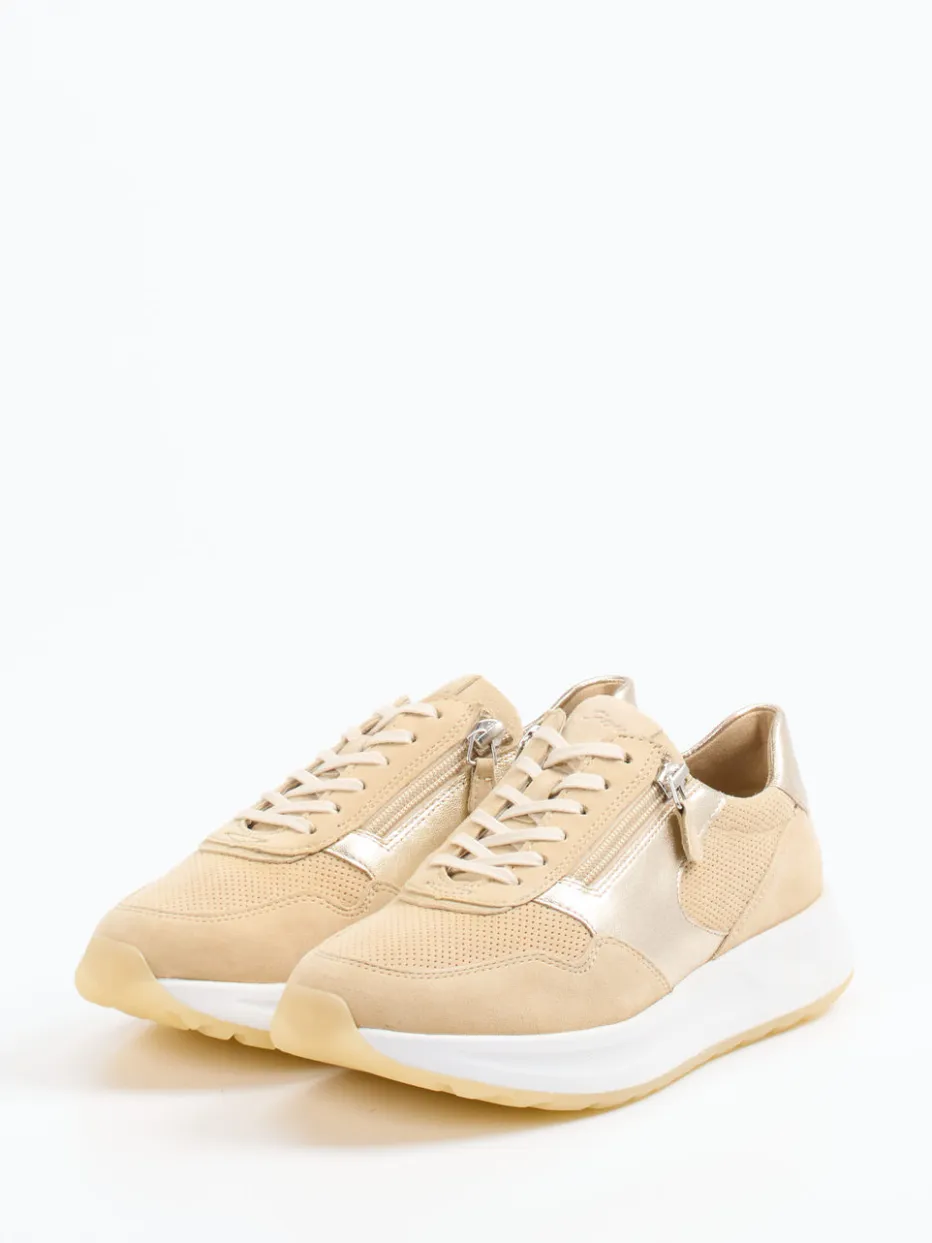 Komfort trifft dezente Raffinesse.Der Damen-Sneaker von Sioux vereint sportive Eleganz mit hohem Tragekomfort. Ob beim Stadtbummel oder im entspannten Alltag – dieser Low-Top Sneaker überzeugt durch seinen Materialmix aus Veloursleder, perforiertem Mesh und Akzenten aus Goldmetallic-Leder. Der Beige-Ton unterstreicht den zeitlosen Look, während die abgerundete Silhouette, das Leder-/Textilfutter und die griffige Gummisohle für angenehmes Laufgefühl sorgen. Dank Schnürung und seitlichem Reißverschluss lässt sich der Schuh komfortabel anziehen. Inspirierende Streetwear-Einflüsse machen ihn ideal für trendbewusste Casual-Styles. Ein modischer Komfortschuh mit dezenter Luxus-Note – typisch Sioux.