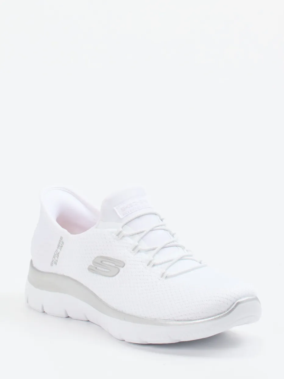 Sportiver Minimalismus mit Komfort.Skechers präsentiert mit diesem Slip-On Sneaker ein ideales Freizeitmodell für Damen. Ob auf dem Weg zum Training oder beim Stadtbummel – die Kombination aus atmungsaktivem Textilmesh und silberfarbenen Details sorgt für ein leichtes Tragegefühl und moderne Optik. Die strukturierte Oberfläche in Weiß verleiht dem Low-Top-Sneaker eine cleane Linie, während elastische Schnürung und verstärkte Slip-in-Ferse unkomplizierten Einstieg garantieren. Die Air-Cooled Memory Foam-Innensohle erhöht den Tragekomfort zusätzlich. Besonders passend zu sportlich-lässigen Outfits. Ein Sneaker, der Komforttechnologie mit stilvoller Funktionalität verbindet – typisch Skechers.