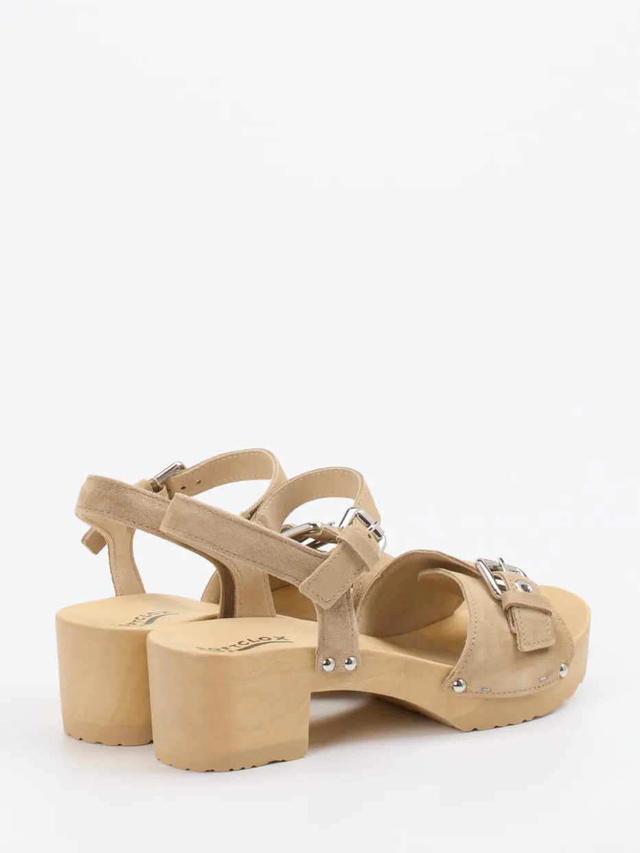 Die biegsame Holzsohle mit Gummigelenken verleiht dieser Clogsandale ein angenehmes Tragegefühl. Das sandbeige Veloursleder mit silberfarbenen Details unterstreicht den skandinavisch-vintageinspirierten Look.