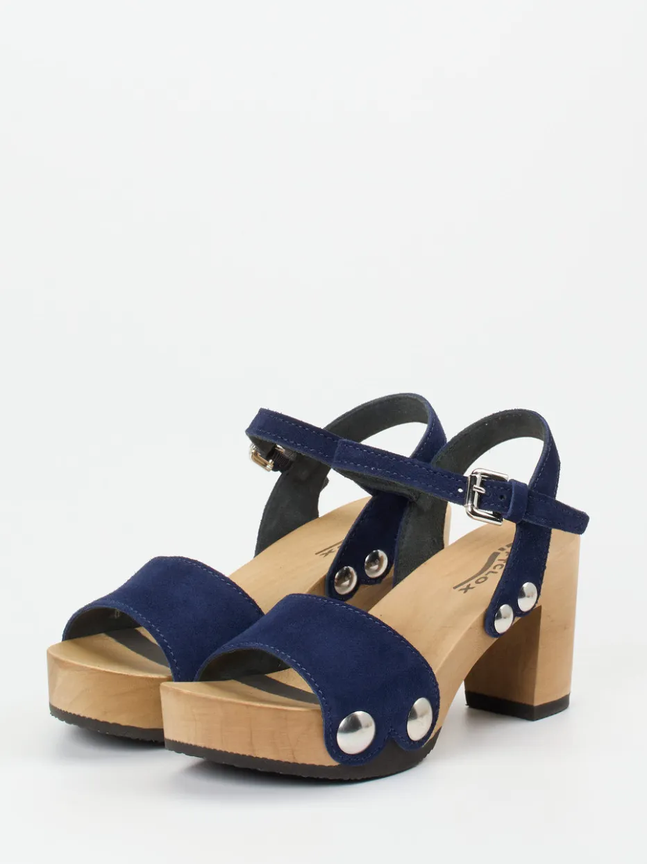 Der retro-inspirierte Look trifft auf Komfort: Marineblaues Veloursleder, Holzsohle und Blockabsatz vereinen sich zu einem trendstarken Sommermodell mit hohem Stilfaktor.