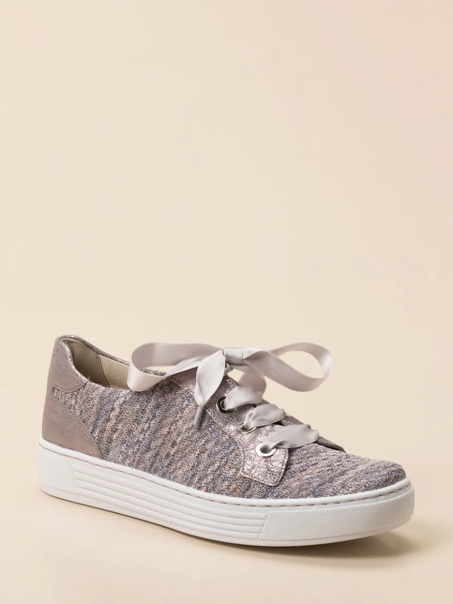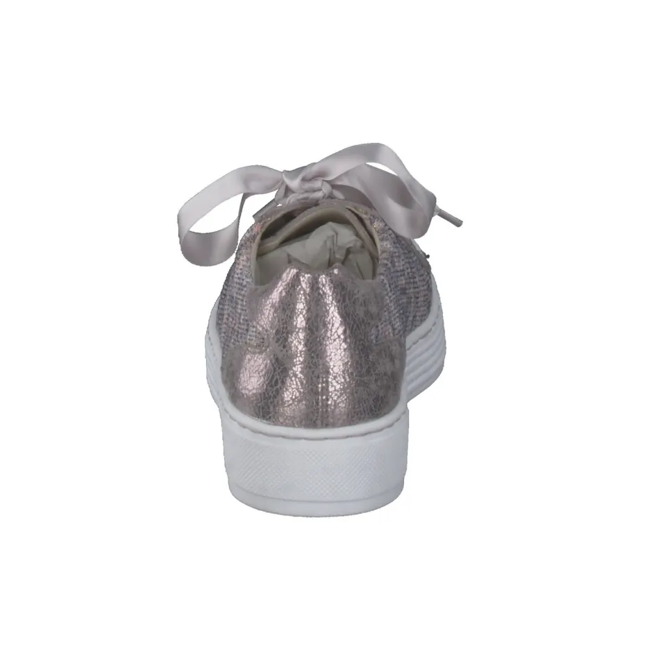 Der feminine Sneaker kombiniert schimmerndes Textil mit roséfarbenen Metallicdetails und bietet durch Komfortweite H sowie dämpfende Sohle angenehmen Tragekomfort im Alltag.