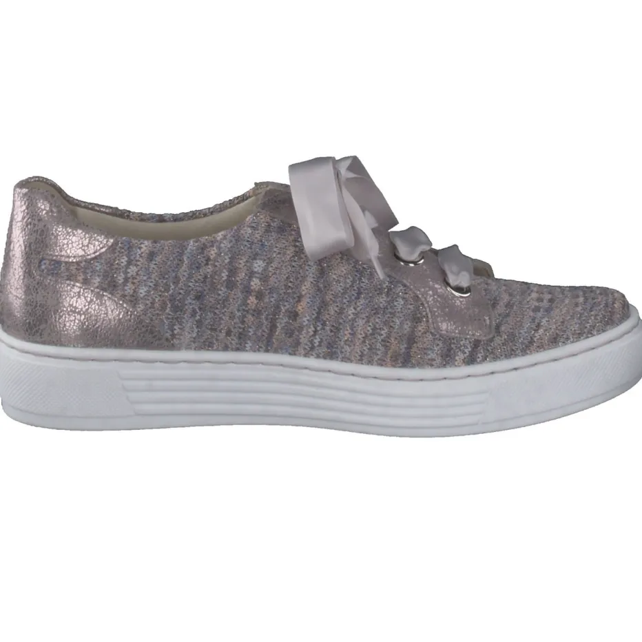 Femininer Komfort für stilvolle Alltagslooks.Solidus präsentiert mit diesem Freizeitsneaker ein Modell, das Modebewusstsein und Tragekomfort elegant vereint. Ideal für Freizeit und Urlaub besticht der Sneaker durch leichtes Textil mit melierter, glänzender Oberfläche in sanften Rosé- und Silbertönen. Dekorative Satin-Schnürbänder sorgen für ein weiches Finish, während die niedrig klassische Silhouette mit verstärkter Ferse Stabilität bietet. Der Metallic-Effekt an Ferse und Ösen setzt dezente Highlights im Sinne des „Quiet Luxury“-Trends. Die weiße Gummisohle mit Luftpolster wirkt federleicht und sorgt für komfortables Gehen. Perfekt zur Cropped-Hose oder einem fließenden Sommerkleid – ein Schuh mit femininer Leichtigkeit und funktionalem Mehrwert.