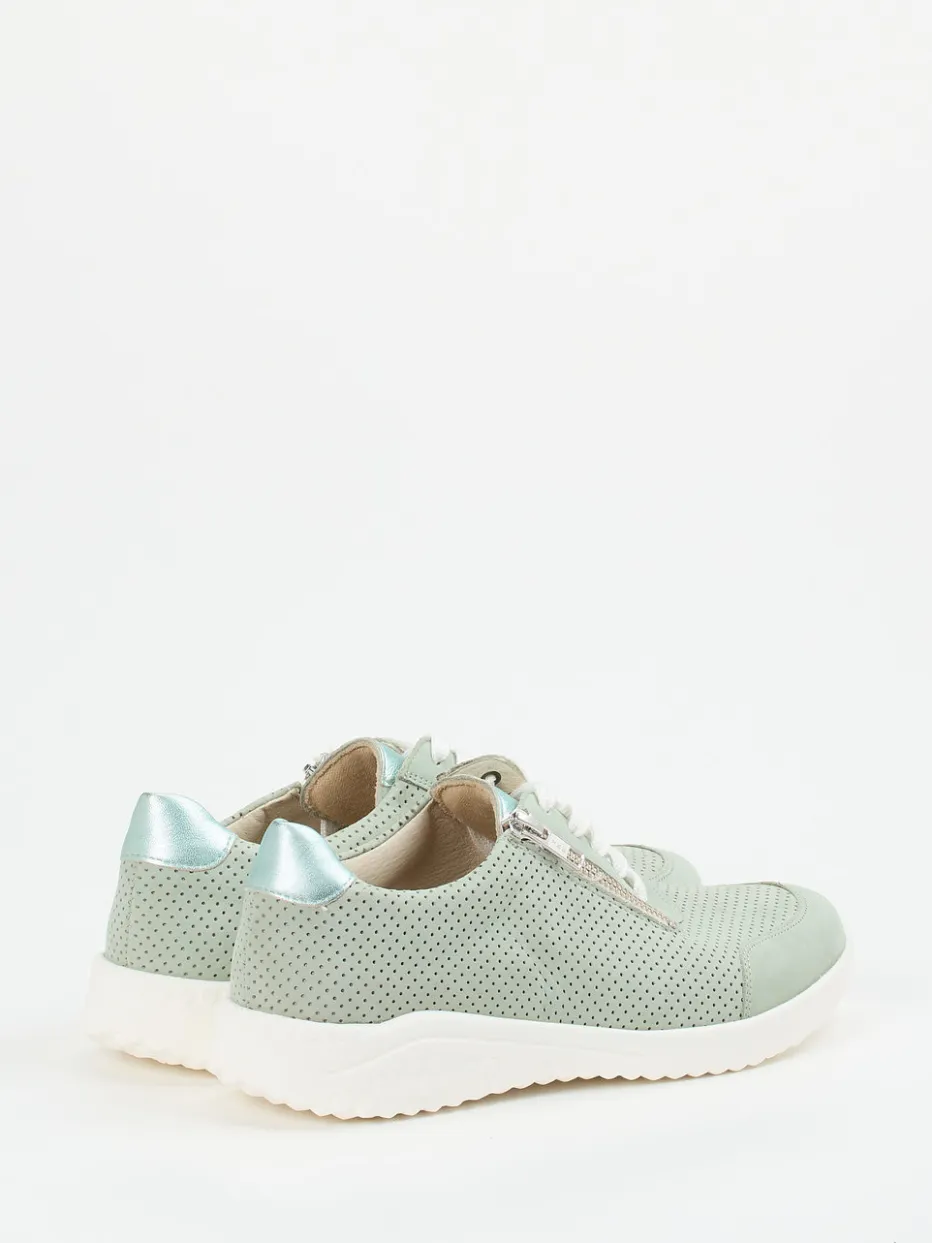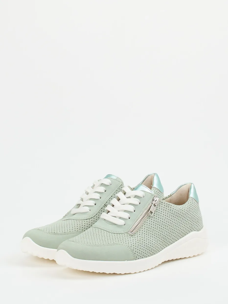 Ideal für entspannte Alltagssituationen ist der Damen-Sneaker dank seiner ergonomischen Sohle, komfortablen Weite H und dem weichen, samtig genarbten Nubukleder ein verlässlicher Begleiter. Das salbeigrüne Obermaterial wirkt durch silberfarbene Metallic-Akzente an Ferse und Reißverschluss besonders feminin. Die Kombination aus Schnürung und seitlichem Reißverschluss erleichtert den Einstieg, das gepolsterte Fußbett lässt sich bei Bedarf austauschen. Pastellfarbene Details verweisen auf aktuelle Frühling/Sommer-Trends. Perfekt zu Jogpants oder leichten Jacken.