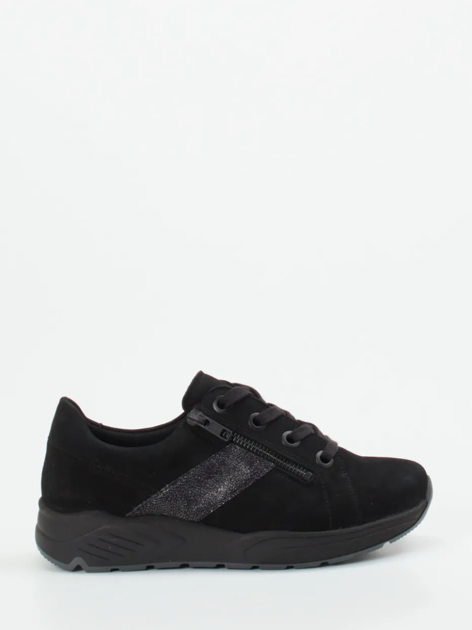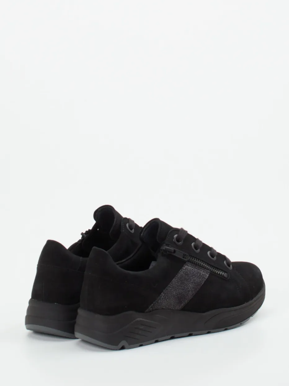Dieser Komfort-Sneaker vereint anschmiegsames schwarzes Veloursleder mit praktischem Reißverschluss und dezentem Glitzerdetail – ideal für komfortorientierte Alltagslooks.