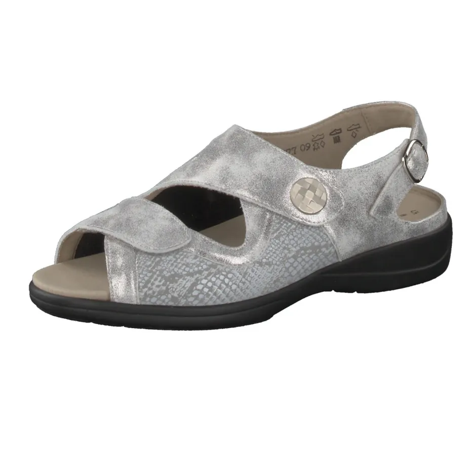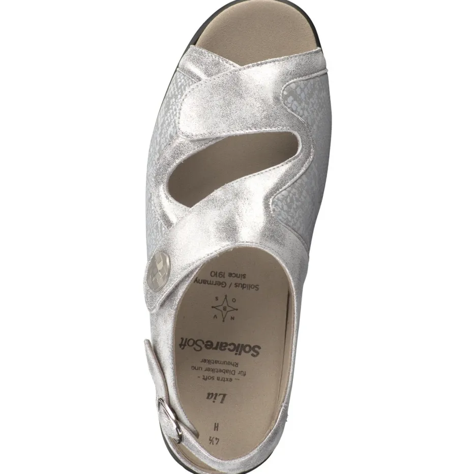 Glänzender Komfort für anspruchsvolle Füße.Die Marke Solidus präsentiert mit dieser Komfortsandale ein Damenmodell für entspannte Alltagsmomente. Das hellgrau-silberfarbene Metallicleder mit strukturierter Prägung in Schlangenmuster wirkt modern und edel. Die offene Silhouette mit verstellbarem Fersenriemen und seitlichen Klettverschlüssen ermöglicht individuelle Anpassung. Das gepolsterte Wechselfußbett, speziell für Diabetikerinnen und Rheumatikerinnen entwickelt, sorgt für hohen Tragekomfort. Eine flexible, rutschhemmende PU-Sohle in Schwarz ergänzt die Ausstattung. Das glänzende Accessoire unterstreicht den femininen Look. Ideal für Komfortliebhaberinnen, die auch optisch Akzente setzen möchten – mit Solidus-typischer Leichtigkeit.