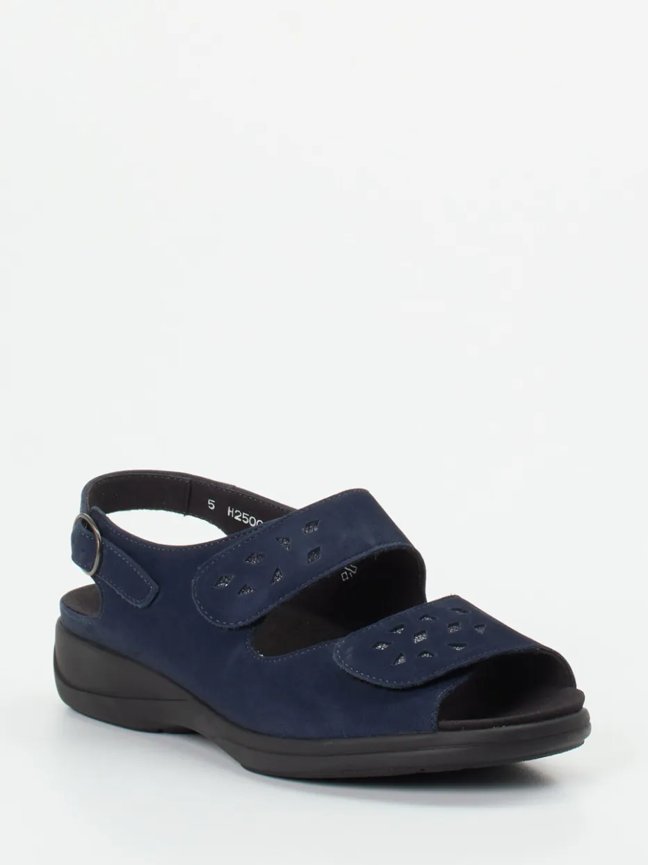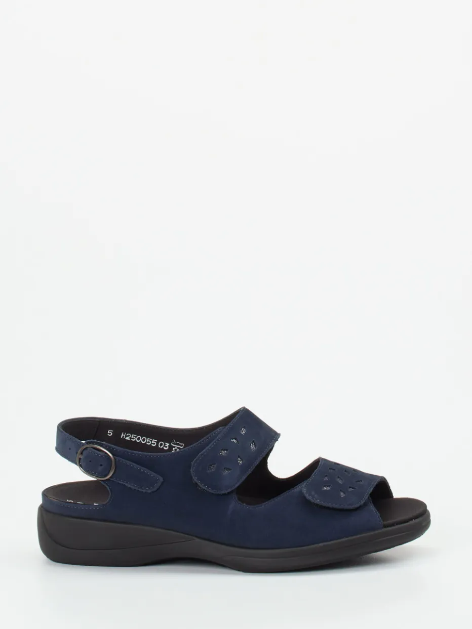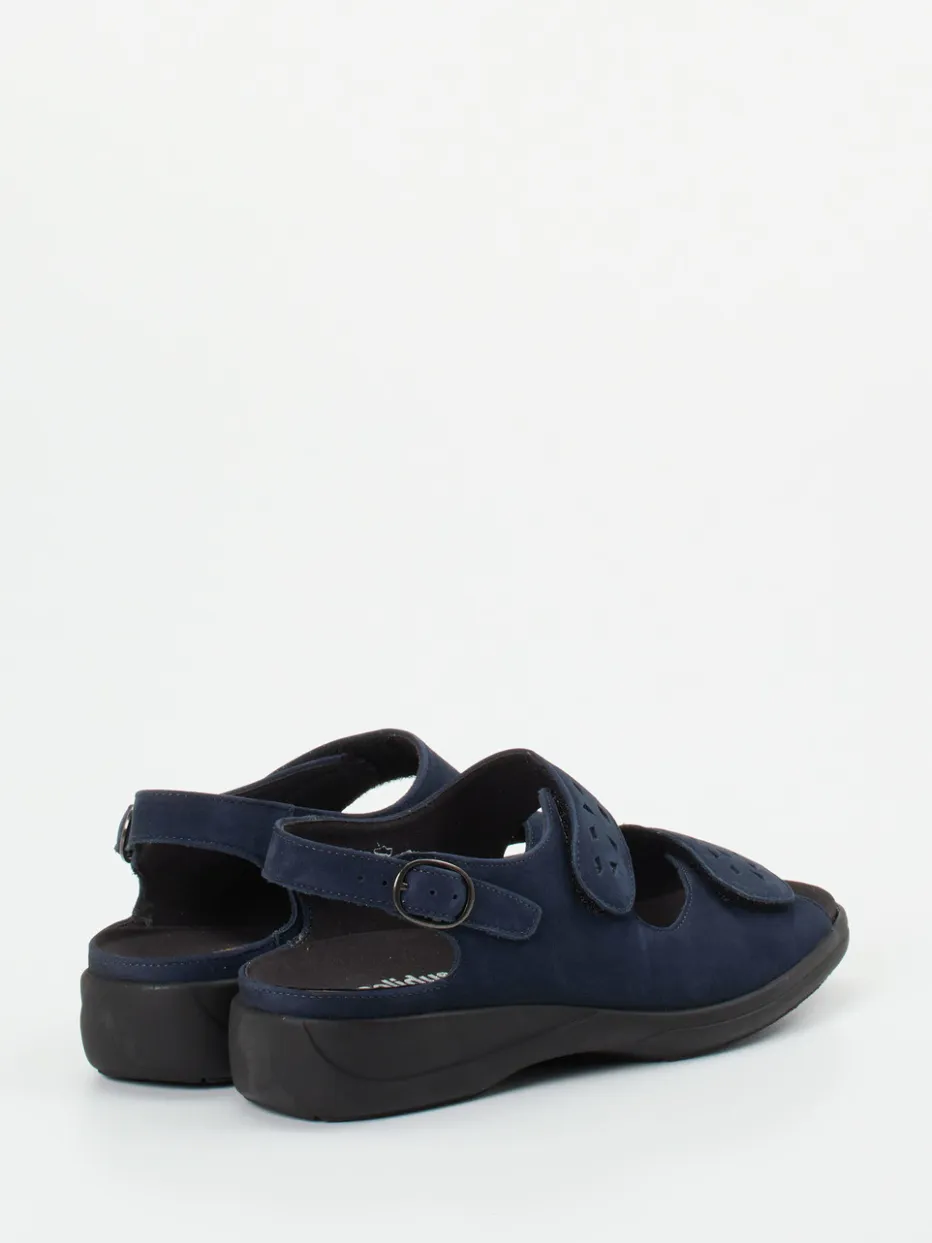 Stil trifft auf Komfort.Die Damen-Komfortsandale von Solidus vereint bequemes Tragegefühl mit reduziertem Design. Für entspannte Spaziergänge oder lange Tage auf den Beinen bietet sie dank Nubukleder mit samtiger Veloursstruktur, weich gepolstertem, austauschbarem Fußbett und ergonomischer Form spürbaren Komfort. Das tiefdunkle Blau ergänzt den schlichten Look, akzentuiert durch dezente Cut-Outs auf den zwei Klettverschlüssen und eine anpassbare Fersenschnalle. Die leichte PU-Sohle mit Dämpfung sorgt für ein geführtes Abrollen und eignet sich auch bei orthopädischen Anforderungen. Der minimalistische Stil harmoniert mit Casual-Outfits wie Stretchhose und fließender Bluse. Solidus steht für funktionale Mode mit hohem Wohlfühlfaktor.